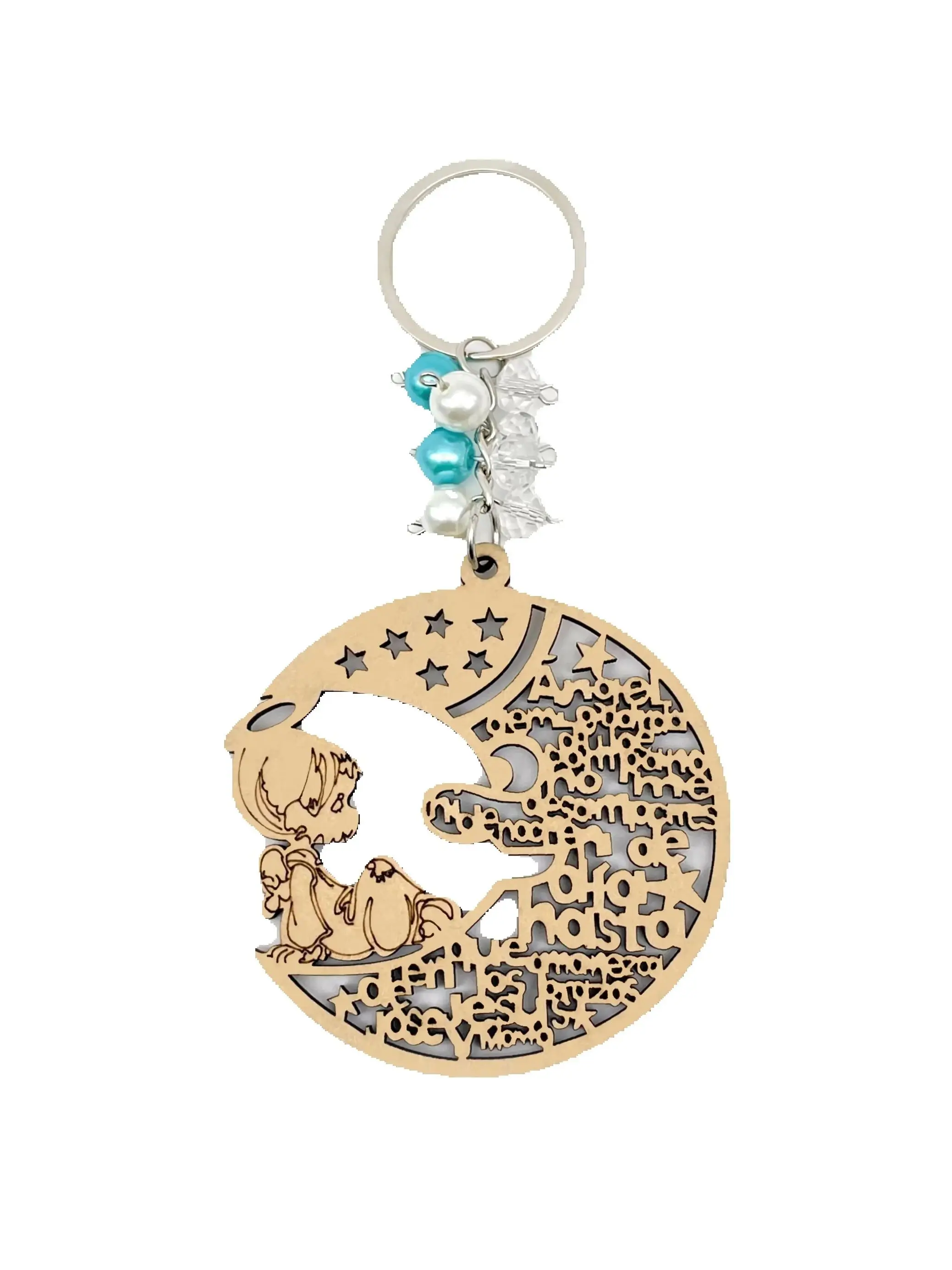 Listing includes 12Pcs Wood Laser Cut Angel Moon Boy keychain.