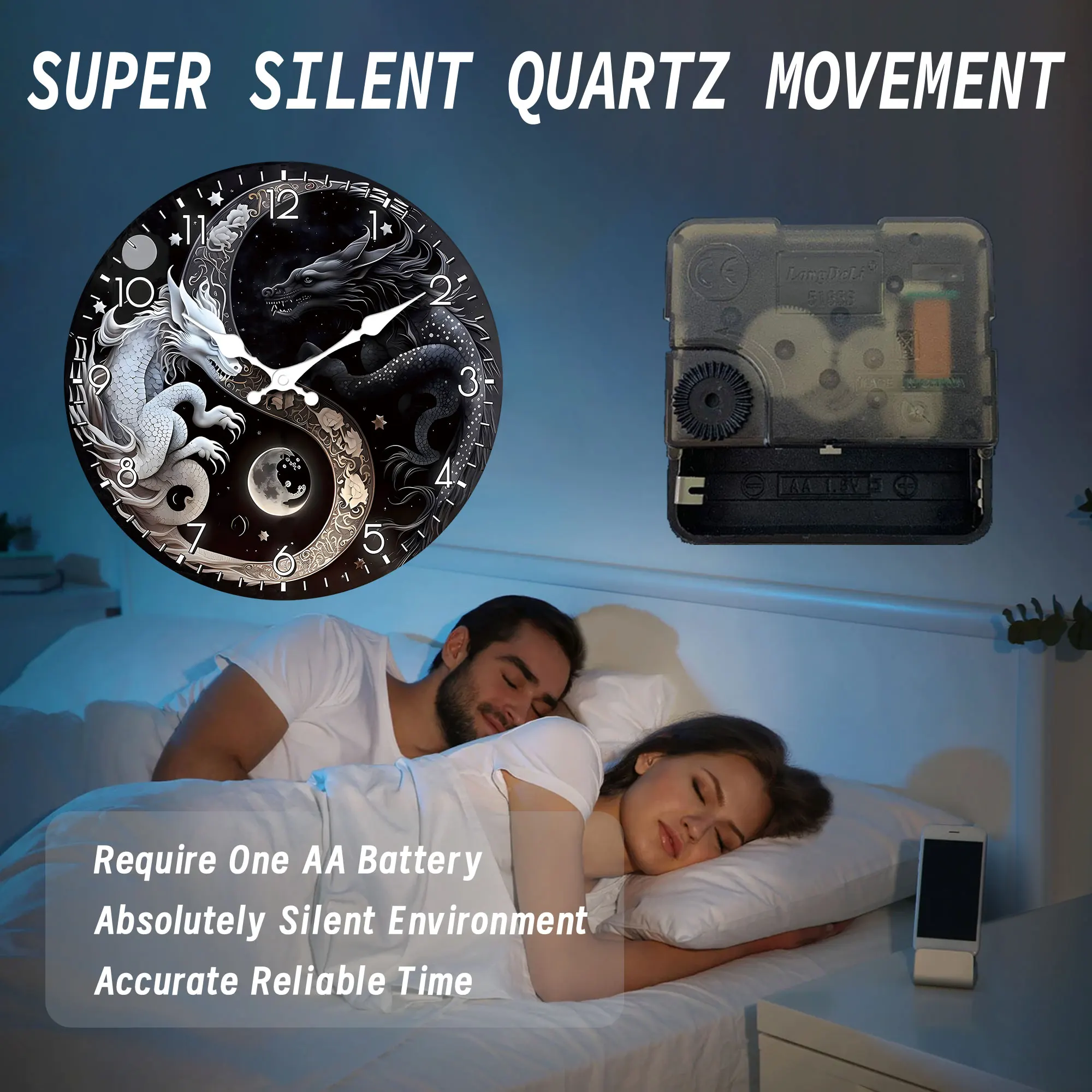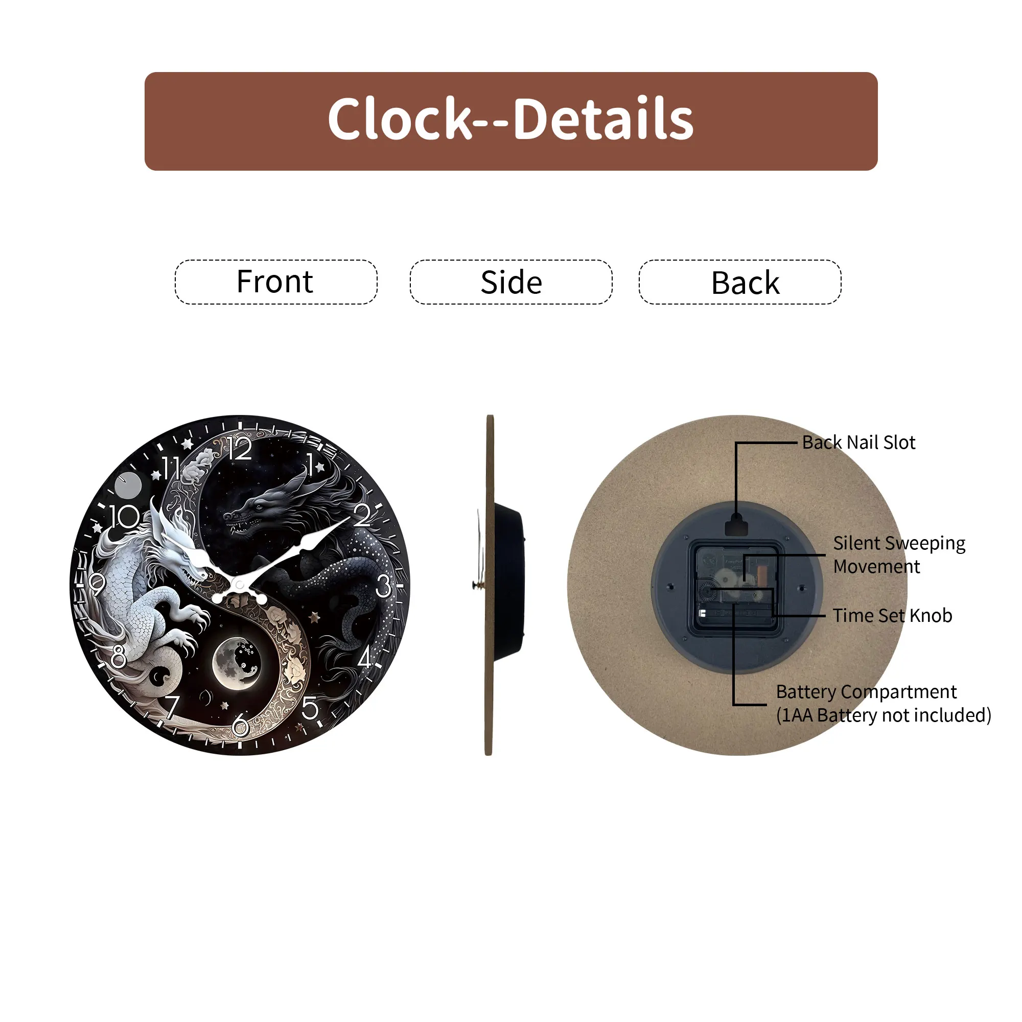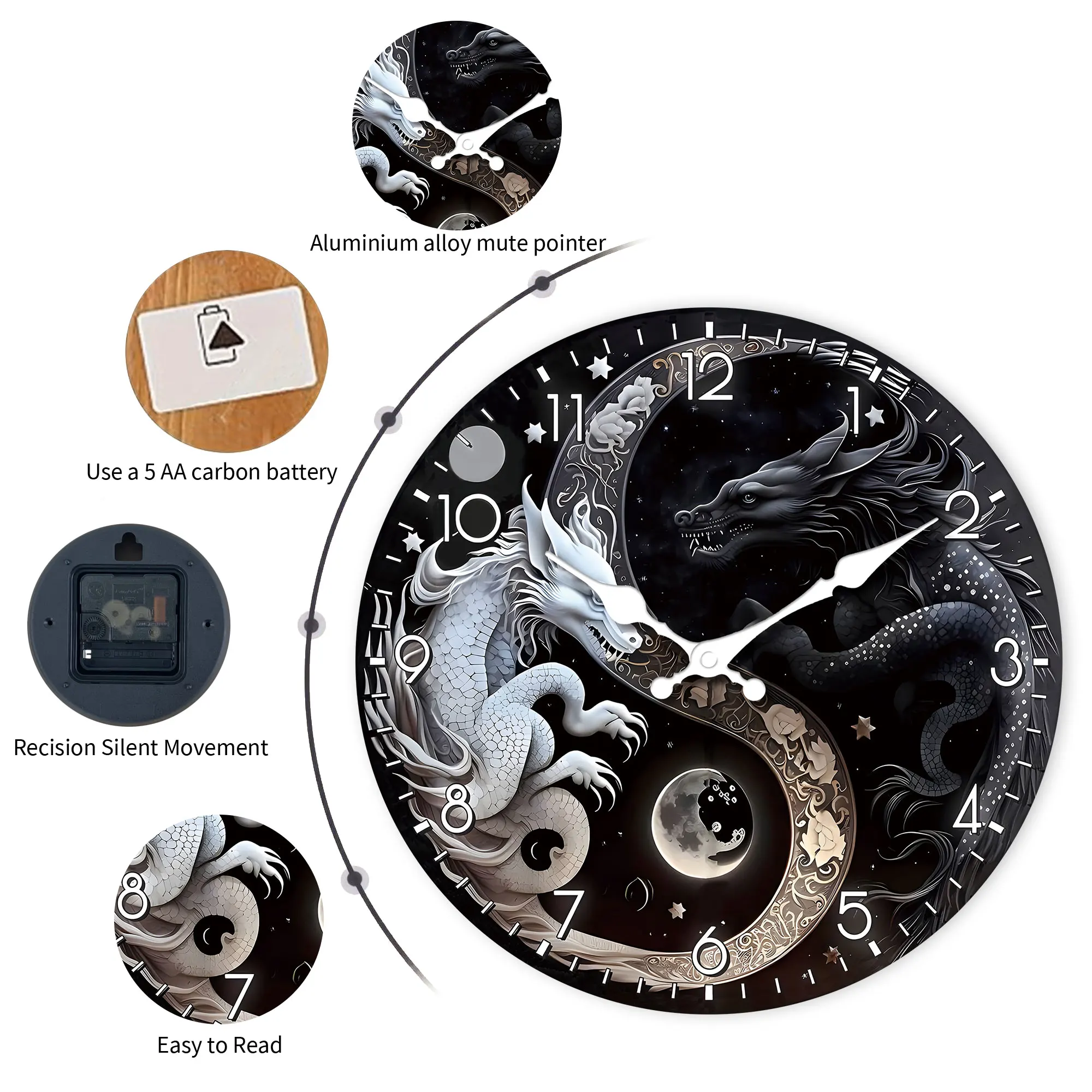 1pc round wooden wall clock, Oriental Legend story Black and White dragon design wall clock - Silent non-ticking clock, suitable