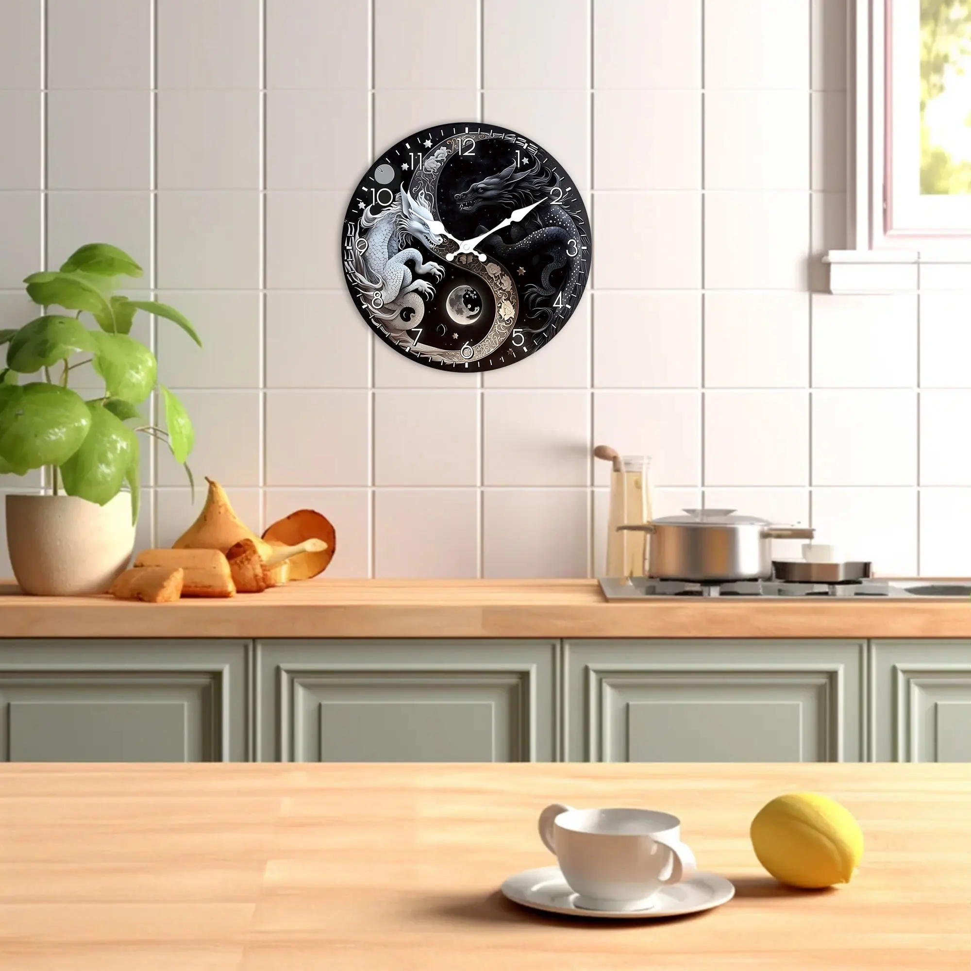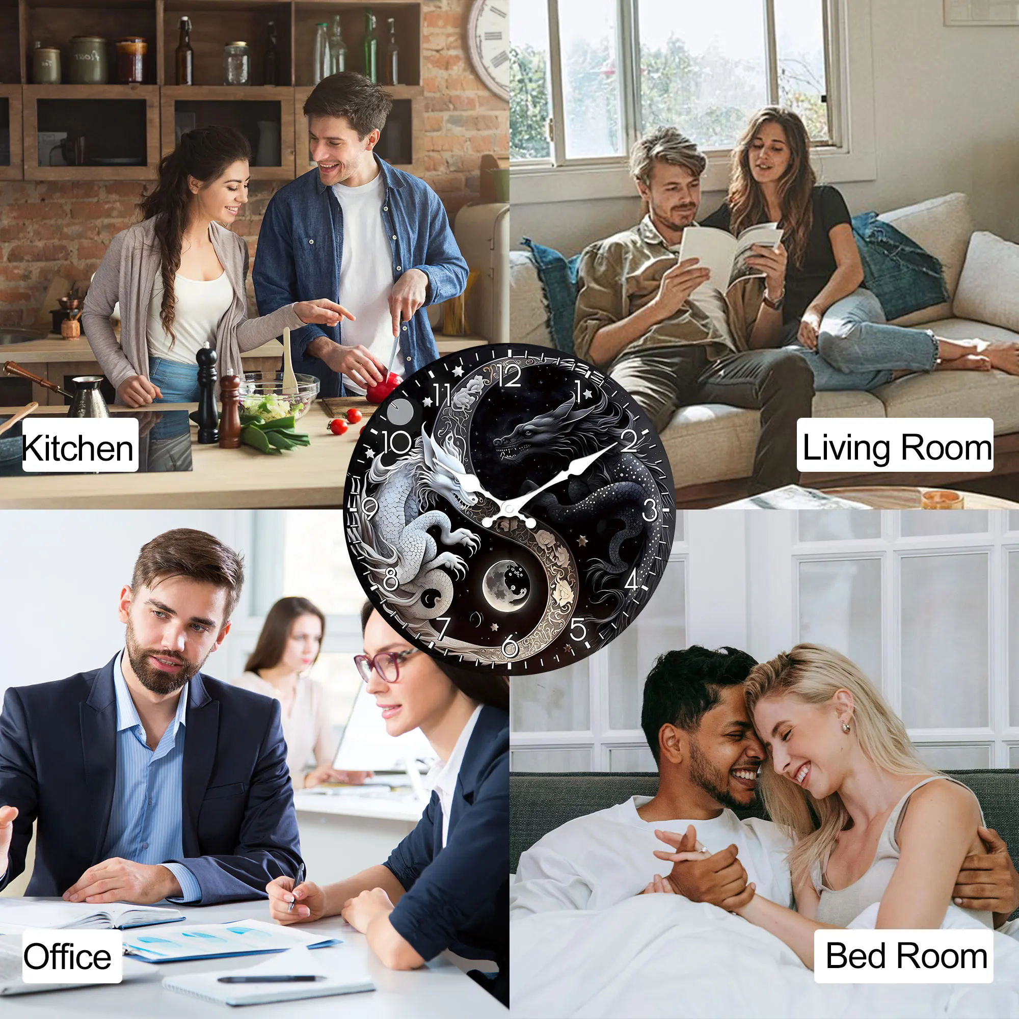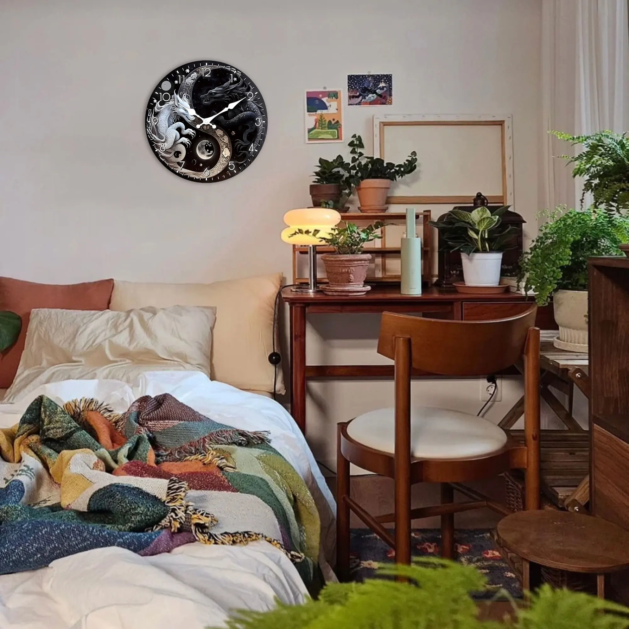 1pc round wooden wall clock, Oriental Legend story Black and White dragon design wall clock - Silent non-ticking clock, suitable