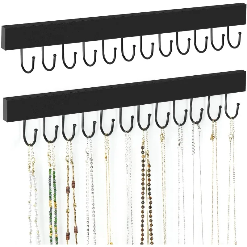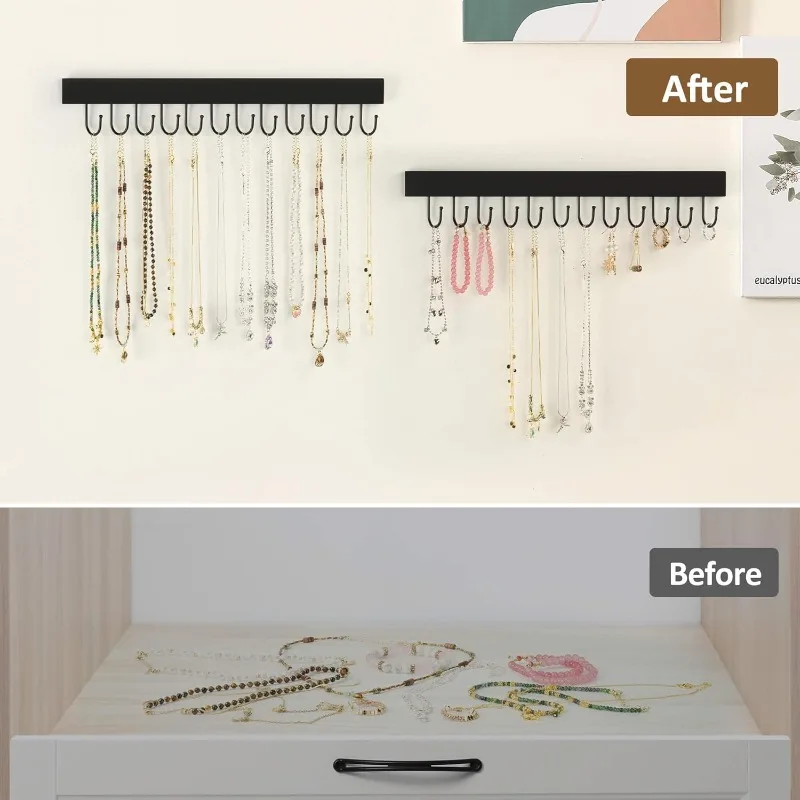 Wall-Mounted Large-Capacity Jewelry Organizer Set: This set includes two 12-hook wooden jewelry racks that can be easily mounted on the wall. With room for up to 24 necklaces, it keeps your vanity tidy and clutter-free. Say goodbye to tangled necklaces and bracelets once and for all.