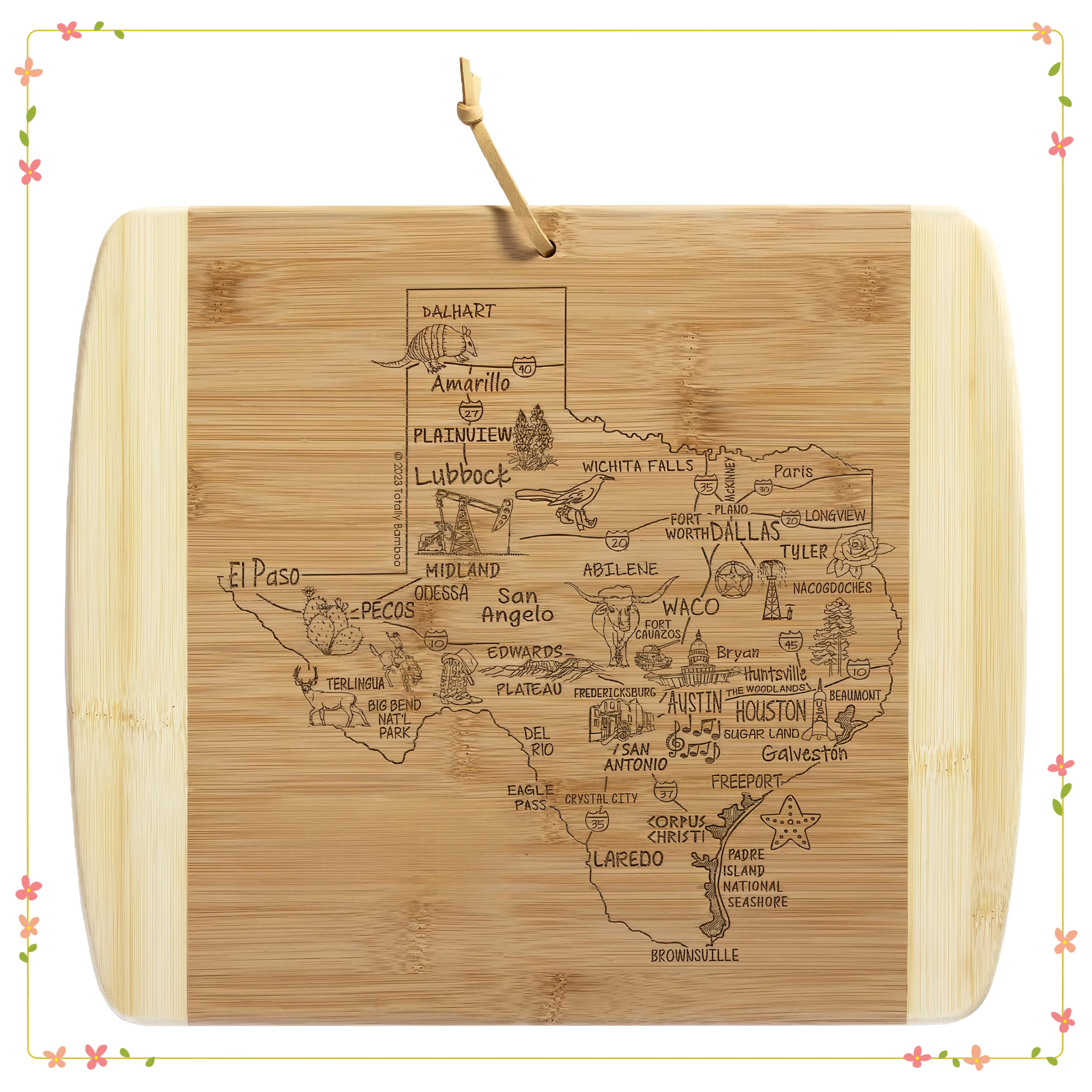 •  This beautifully crafted bamboo cutting board features fun, laser-engraved artwork of the state outline and all the top cities, places and attractions. From El Paso to Dallas. Austin to Houston. Padre Island to the Panhandle. Every part of the state is well represented! It's perfect for adding a bit of local flavor to your next charcuterie or cheese board. It's a wonderful conversation-starter for parties or holiday get-togethers more of the state map artwork is revealed as cheese, meat and other favorite treats are served. The reverse side of the board is blank and provides an ideal, knife-friendly cutting surface with all the benefits of a bamboo cutting board. It's sized just right for everyday cutting tasks at 13" x 11" x 1/2". Cut down on dishes by preparing food on the cutting board side and serving on the engraved charcuterie board side! The included hang tie allows the board to double wonderfully as wall art hang it in the kitchen, dining room or den to show off your love of the state. The board cleans easily with hand washing, do not soak or wash in the dishwasher. This state cutting board also makes an outstanding gift for birthdays, housewarmings, Mother's Day, Father's Day, Christmas or any occasion!