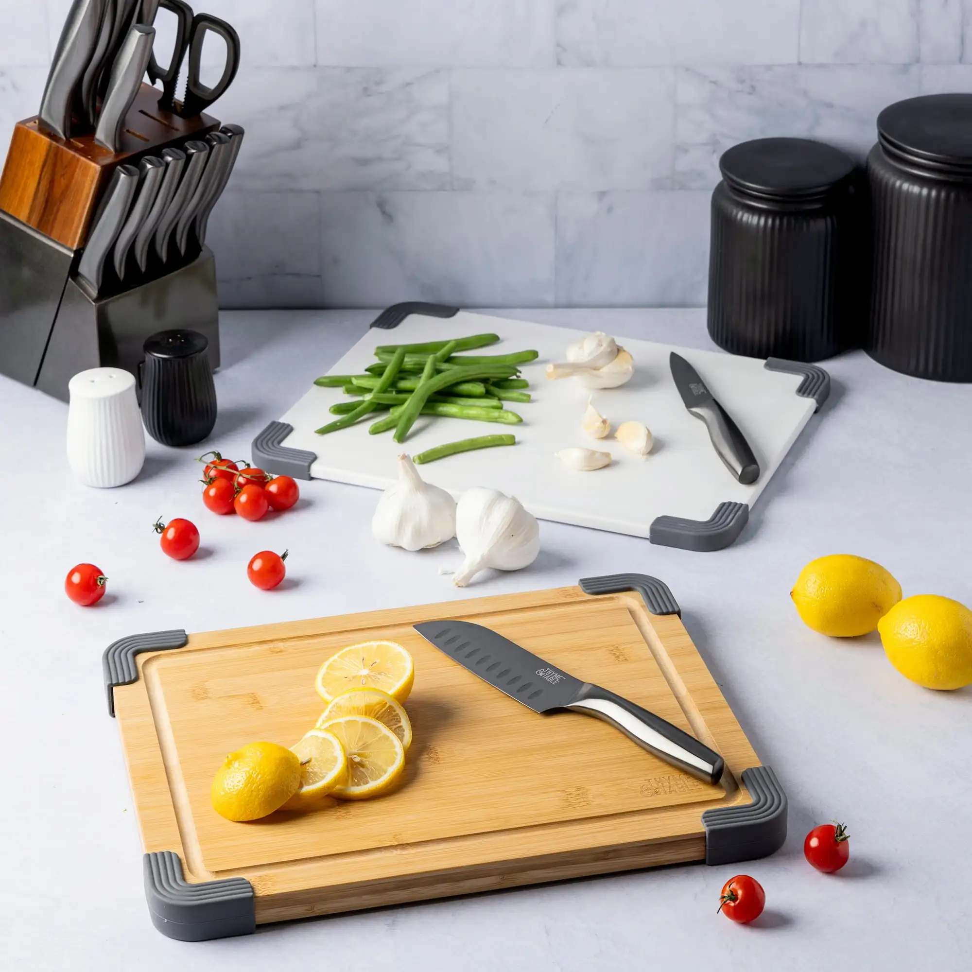 2-Piece Set – Includes one polyethylene cutting board and one bamboo cutting board for a variety of meal prep uses