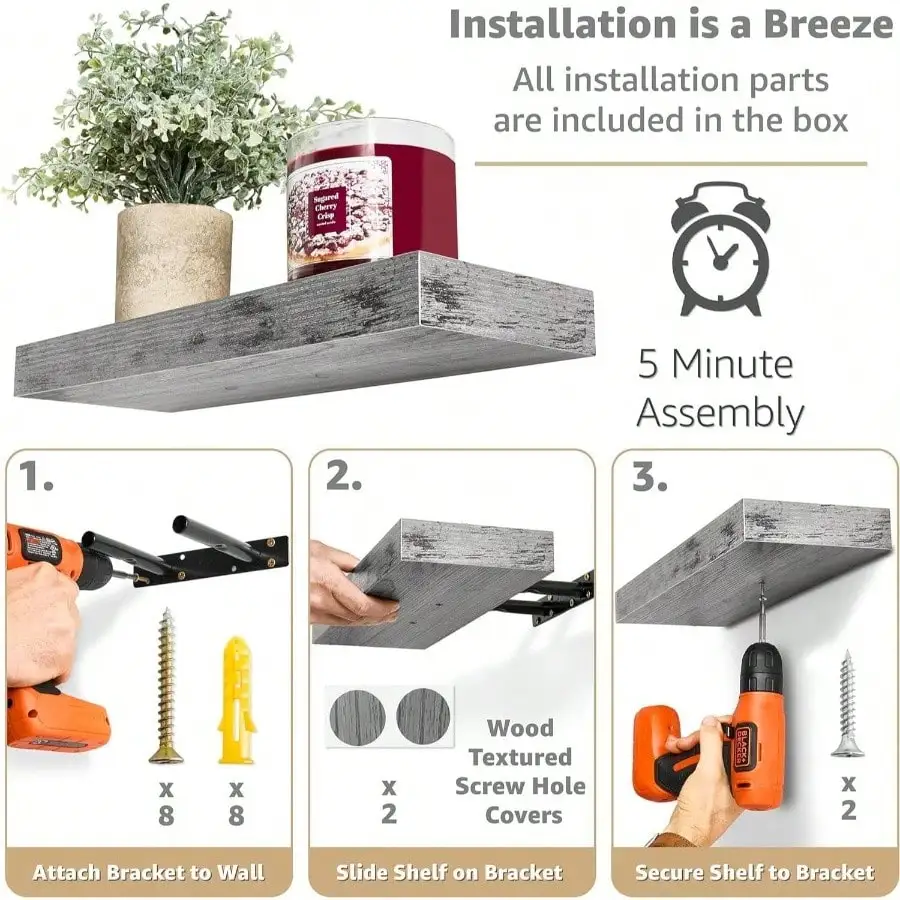 Display your favorite household items and collectibles in style with the rustic floating shelves. They are great for decorations, cosmetics, toiletries, nursery décor and more while adding character to any modern, traditional or rustic space.