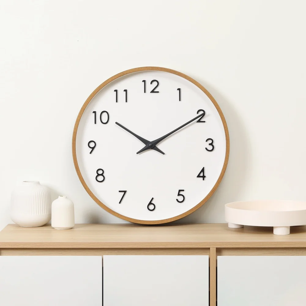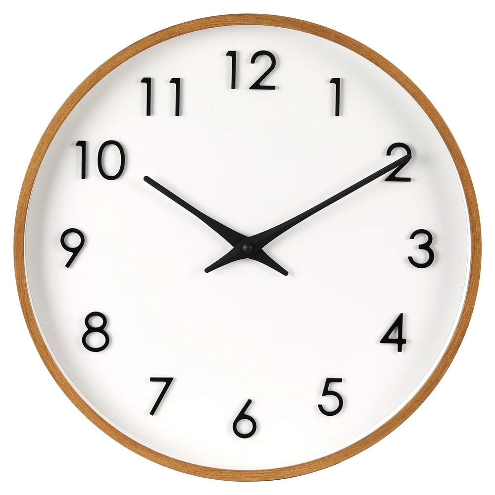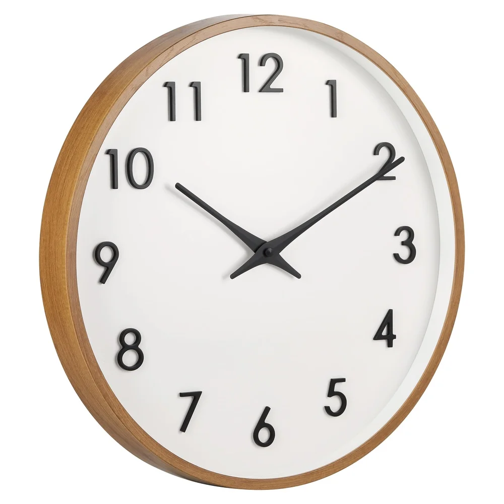 This modern and sophisticated timepiece is sure to be a focal point in any room whether you hang it on the wall or lean on a tabletop.  Featuring raised Arabic numerals in a satin black finish, its modern design will enhance any space with a chic pop.  The warm wood grain finish gives it a contemporary feel, while the dimensional dial with raised numerals lends an aesthetic depth to its profile.  This blend of clean lines and the modern wood grain finish makes the clock not just a functional item but an art piece.  It’s not just a time-telling device; it’s a conversation starter that effortlessly transforms any wall into the perfect focal point.  Easy to hang, it graciously punctuates the room with its presence, making an aesthetically pleasing statement for all to enjoy.