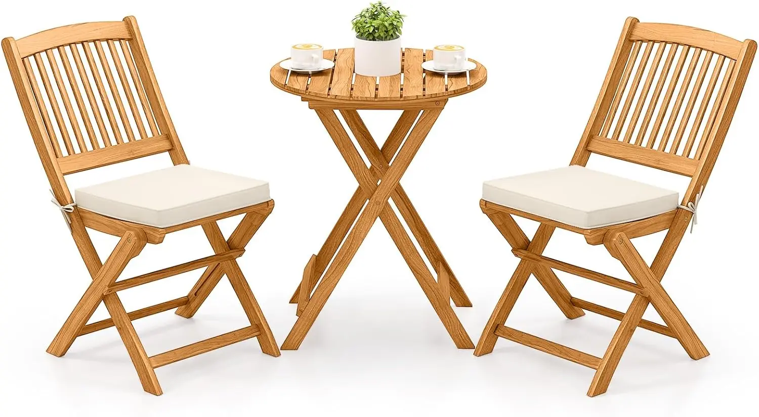 3 Pieces Acacia Wood Patio Folding Bistro Set, Outdoor Table and Chairs Set with Soft Cushions, Patio Furniture Set for Porch, Balcony, Garden, Deck and Backyard