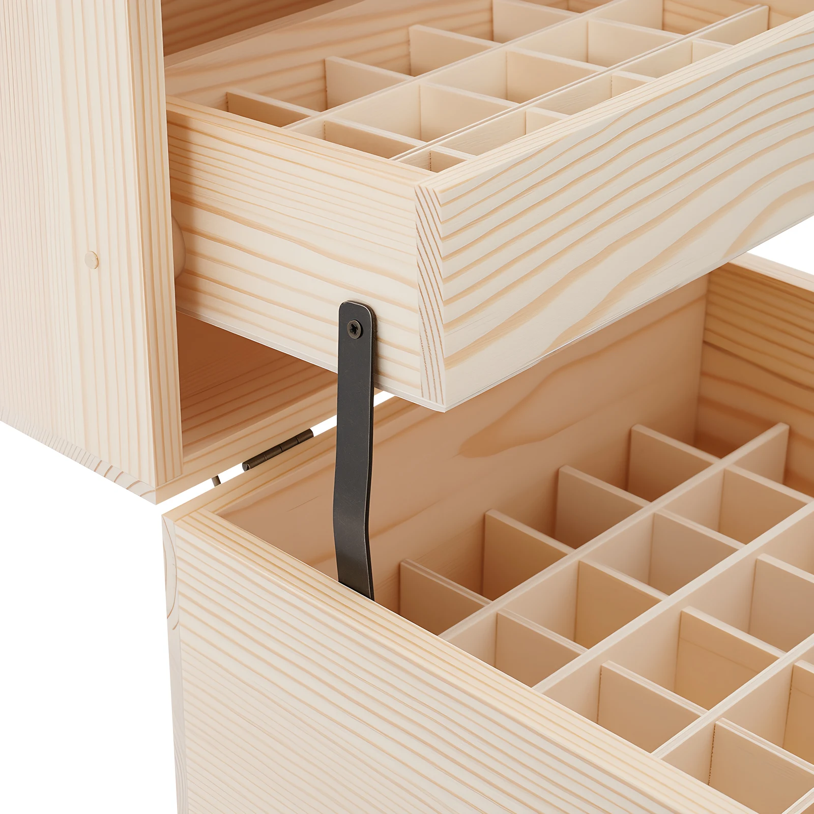 Are you still worried about the mountain of essential oil bottles piled up? Don't worry, our essential oil storage box is here to save you! This storage box is made of high-class materials and exquisite craftsmanship, and can definitely withstand the test of time. Moreover, it has a generous appearance and can seamlessly blend in wherever it is placed. 59 slots are enough to hold all your precious essential oils. With it, you no longer have to worry about not being able to find a bottle of essential oil or accidentally spilling it.