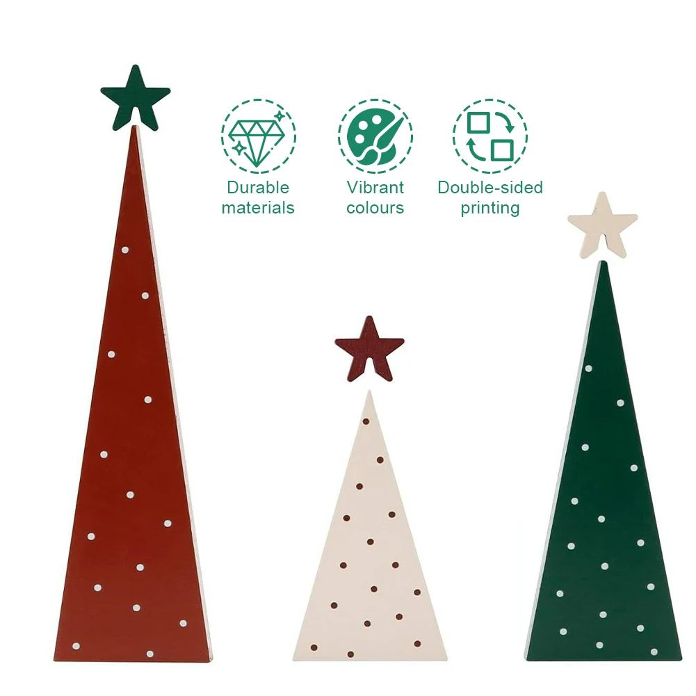 Features: 1.Unique Design: This wooden Christmas tree ornament embodies simplicity and elegance, featuring classic Xmas themes. The layered trays and detachable star atop the tree harmonize beautifully, creating a stunning aesthetic that enhances your holiday decor. 2.Solid Material: Crafted from high-quality wood, these Xmas trees tabletop decorations are sturdy, with smooth edges and non-fading colors. Each part is 0.6cm thick, ensuring they stand firmly on their own, providing lasting beauty and function. 3.High-Quality Double-Sided Printing: Both sides of the rustic Xmas tree table signs showcase vibrant greens, reds, and whites, evoking a festive spirit. The vivid printing is for farmhouse Christmas settings, adding a simplistic yet festive touch to your decor. 4.Versatile Decoration: These Christmas tree wood sign fit various settings, such as mantle tops, tables, or trays, allowing you to decorate bedrooms and living rooms effortlessly. They are also ideal for bars, cafes, restaurants, offering diverse application possibilities. 5.Perfectly Sized: Not only great for indoor farmhouse holiday decor, but they are also gifts for family, children, friends, or loved ones. They will cherish these delightful desktop vertical tree ornaments embellishments. Specification: Origin: Mainland China Material: Wood Product size:190.00x70.00x50.00mm/7.48x2.76x1.97inch