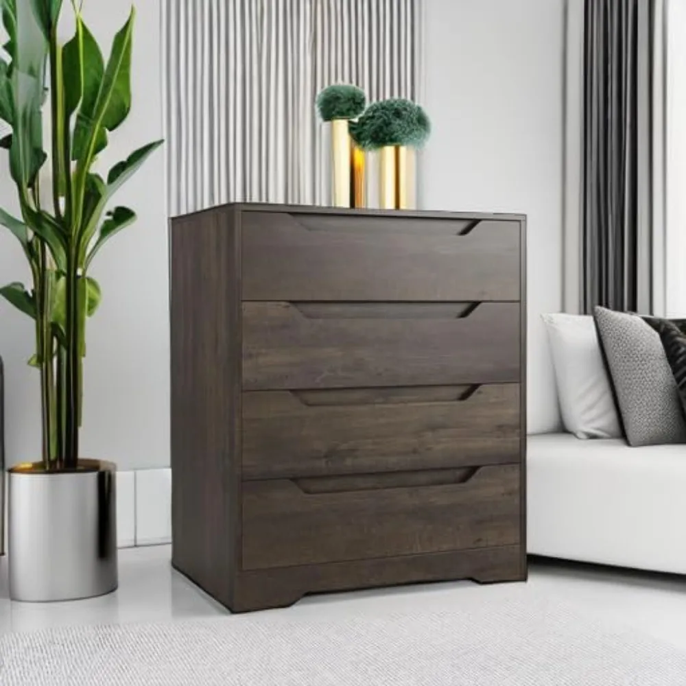 - STYLISH DESIGN: Created with clean lines and minimalist flat-front design, this 4 drawers dresser can easily fit in any decorative style. Unique cut-out handles and elegant bevelled base create a contemporary, clutter free look for your room