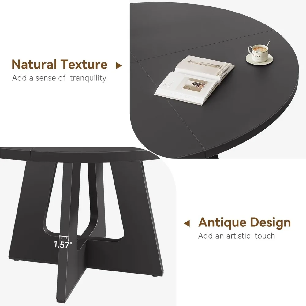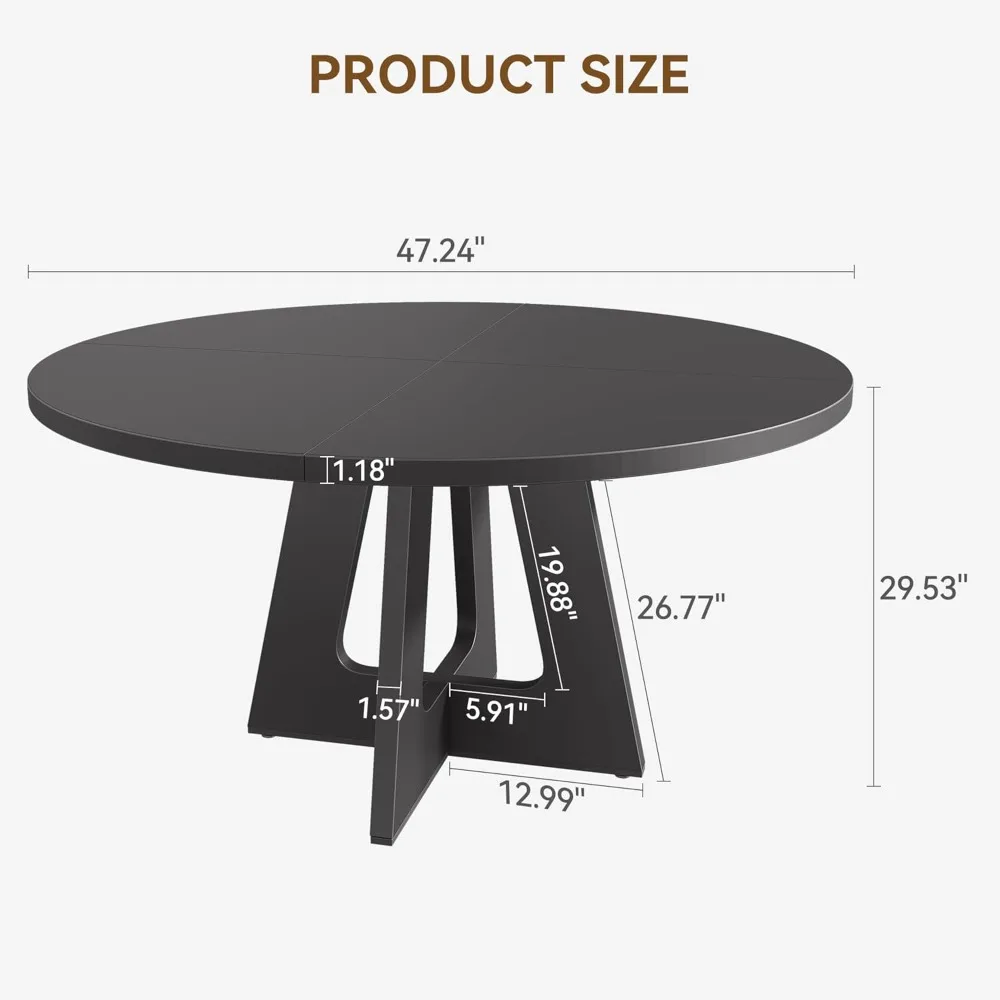 This dining table boasts a solid structure, addressing issues like uneven tabletops and gaps between boards. Its four boards are securely fastened with custom metal brackets, ensuring stability and comfort during meals. The round table has a spacious 47.24-inch diameter and stands 29.53 inches tall, comfortably seating 4 to 6 people without feeling cramped. Its generous size enhances the dining experience with ample space for everyone. Constructed from a 1.18-inch thick MDF board and supported by sturdy 1.57-inch thick wooden legs, this 47-inch round kitchen table can bear a maximum load of 300 pounds. It allows you to place tableware, drinks, and decorations confidently, even near the edges, without the risk of tipping due to uneven weight distribution. The table comes with adjustable leg pads that can be altered by up to 0.39 inches with a simple rotation. These pads feature an advanced anti-slip design, adapting to various heights and keeping the table stable on uneven surfaces, thus eliminating wobbling. Assembling this farmhouse dining table is quick and easy, thanks to the latest design technology that simplifies the installation process. Each accessory is labeled for easy identification, ensuring a smooth and hassle-free assembly experience.