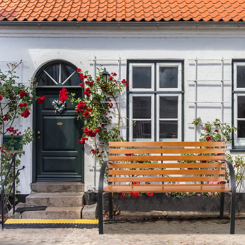 Relax in your garden with this stylish 48" Garden Bench! This garden bench is ideal for both residential and commercial locations. It will fit perfectly on your backyard, porch, and path, or near your entrance and driveway. Classic design gives look and feel of real wood that blend with nature. Curved armrests with a sloped slatted seat offer optimal comfort. Powder-coat steel construction and weather-resistant hardwood provides years of durability as well as easy maintenance. Why not bring it home? Take a seat on this wooden bench and enjoy the great outdoors.