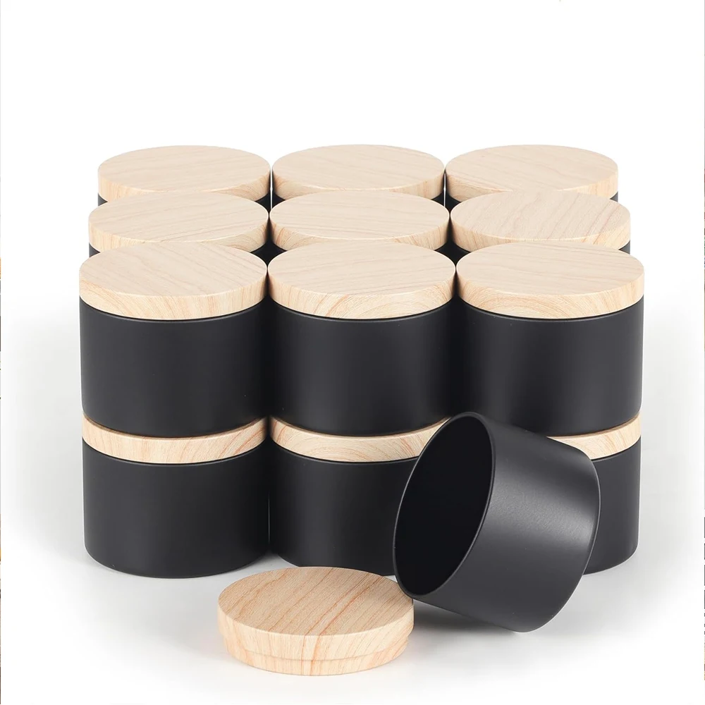 4oz Candle Tins - Matte Black Bulk Empty Candle Jars with Wood Grain Lids, Candle Jars for Candle Making, Storage, and Gift