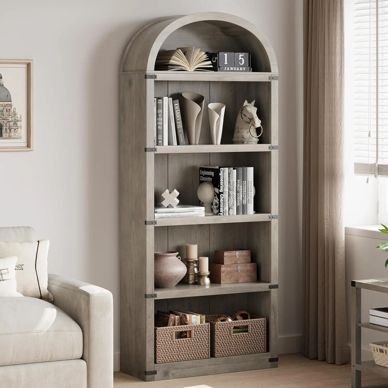 πGenerous Storage Space: Β The arched bookshelf features five generous shelves to offer ample space that is perfect for displaying not only books but also cherished decor, plants, and collectibles, measures 71.65βx 29.92βx 11.88β (H x L x W) with 12.44β between each tier which maximizes vertical space for all of your storage and display needs