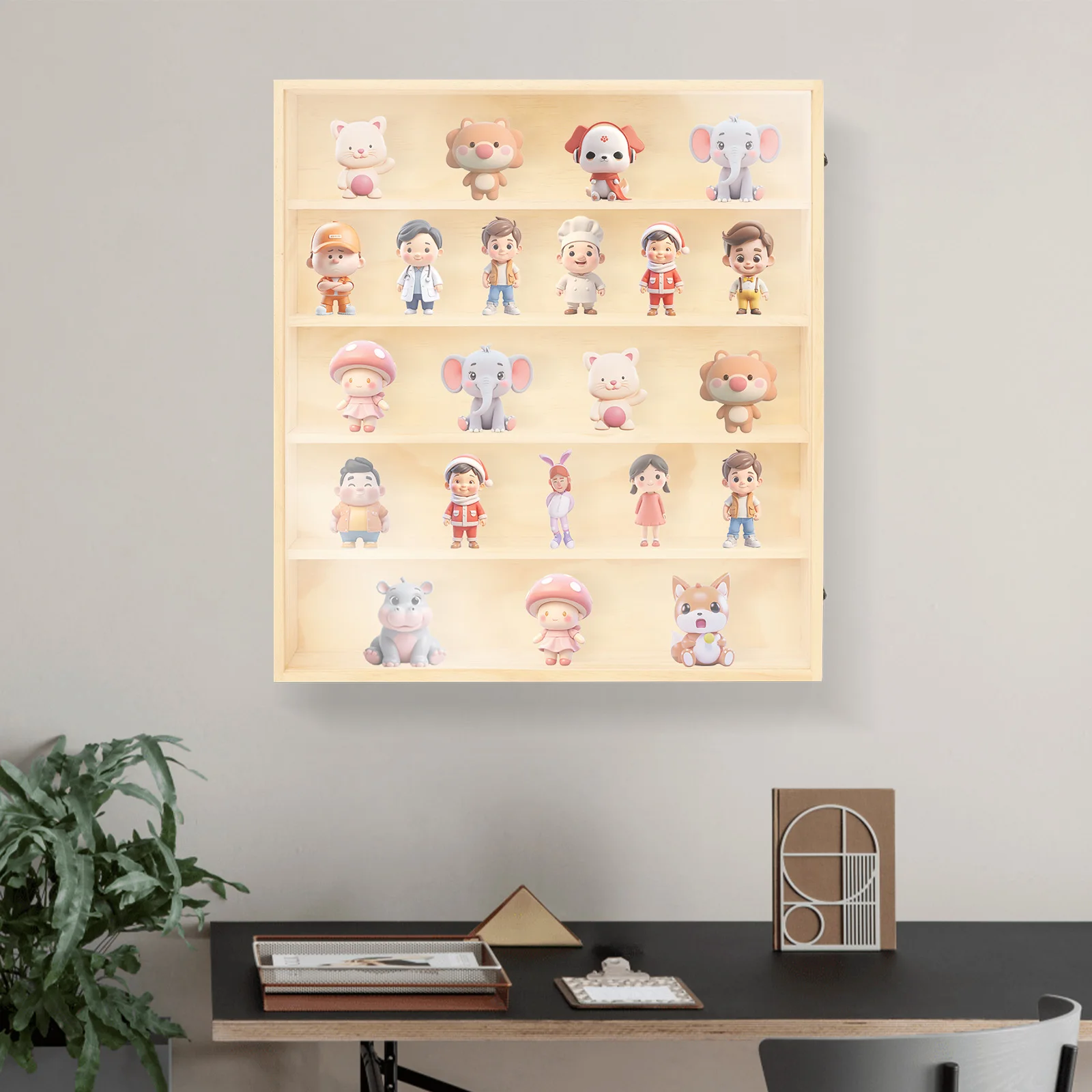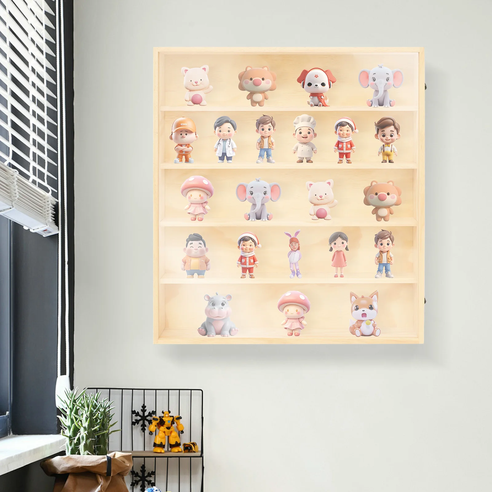 This wooden display cabinet adopts premium materials and a sturdy structure, with a strong load-bearing capacity. It showcases your collection in an orderly manner, making each toy figure look like a work of art. At the same time, it provides a sanctuary for your items, protecting them from damage or dust. It is not just a storage case but also a stage for displaying your action figures. Come and take it home!