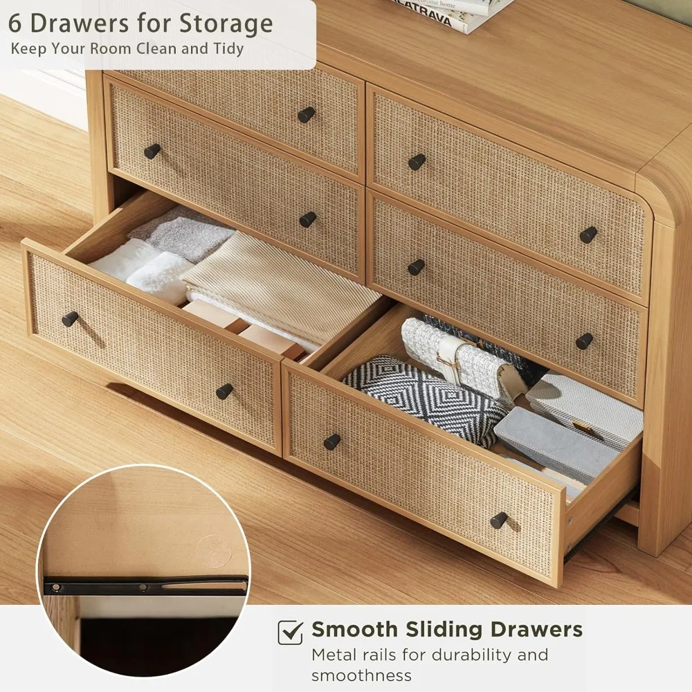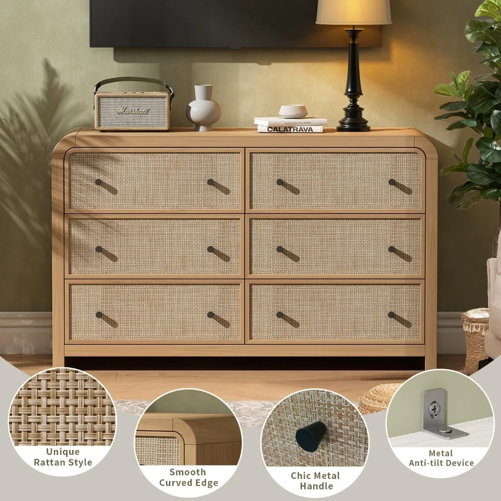 • 【Thickened Arc-shaped Design】 Featuring an exquisite rattan surface paired with a thickened arc-shaped cabinet, 6 drawer dresser seamlessly blends bohemian charm with contemporary design. The natural texture of the rattan complements the smooth, rounded edges of the reinforced frame, creating an aesthetic suitable for both rustic and modern interiors