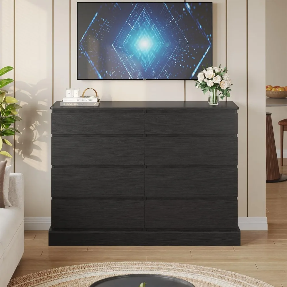 8 drawers dresser for bedroom, black large chest of drawers, long modern double dressers, big clothing storage organizer closet