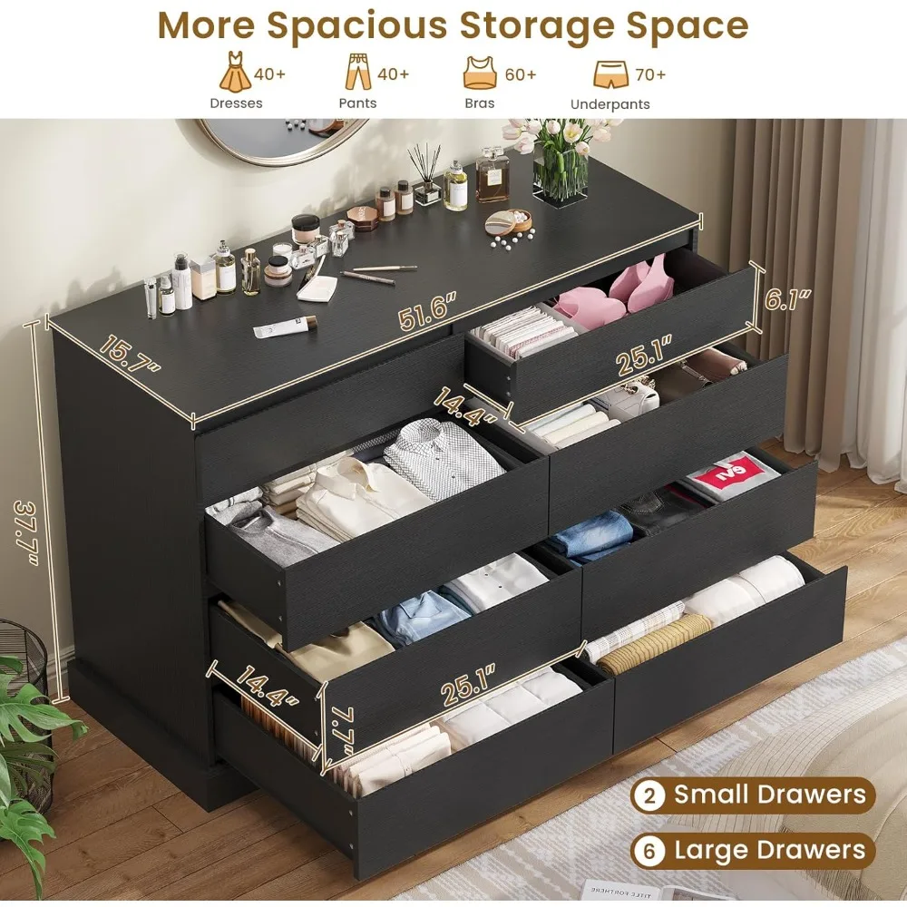 • SPACIOUS STORAGE - This dresser features 8 storage drawers providing enough space to organize different kinds of stuff, your clothes, makeup cosmetics, blankets, and bits and pieces. The Dimensions of the dresser are 51.6 inches (L) * 15.7 inches (D) * 37.7 inches(H).