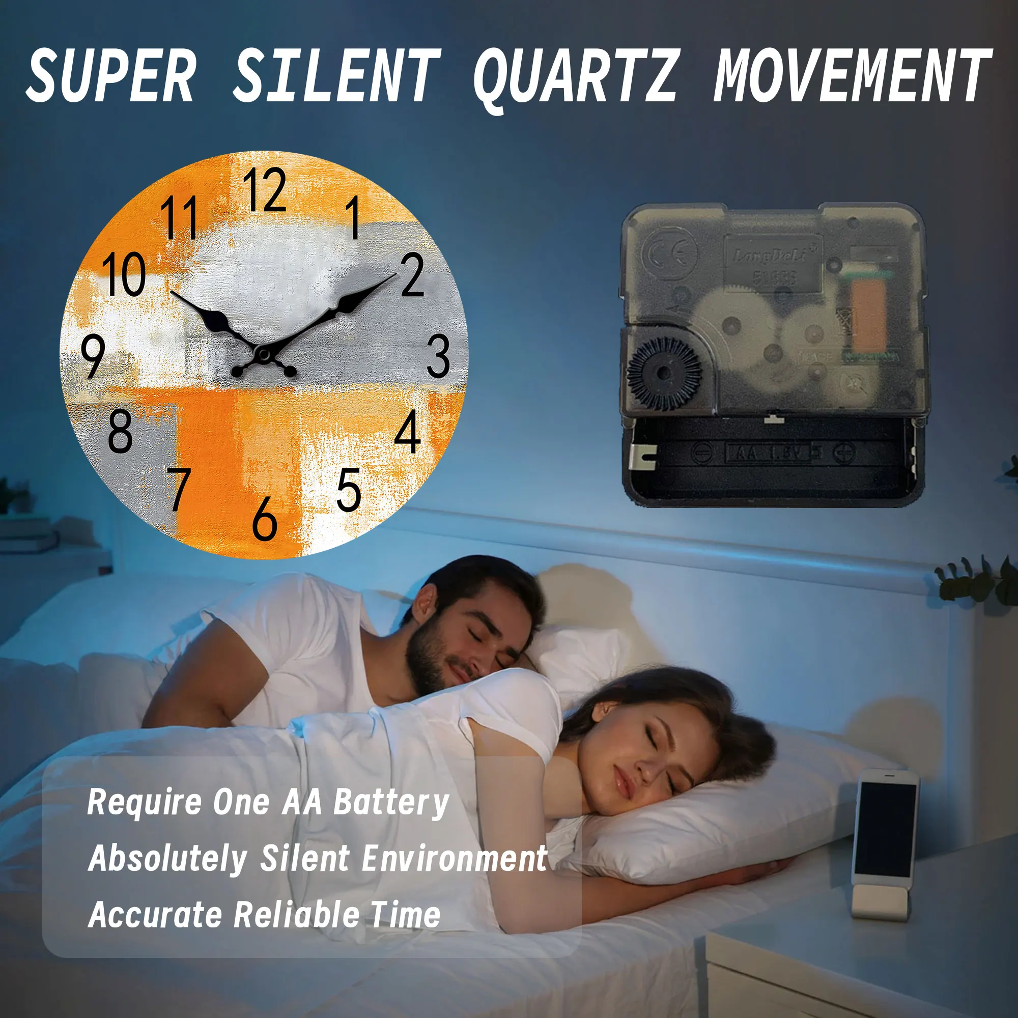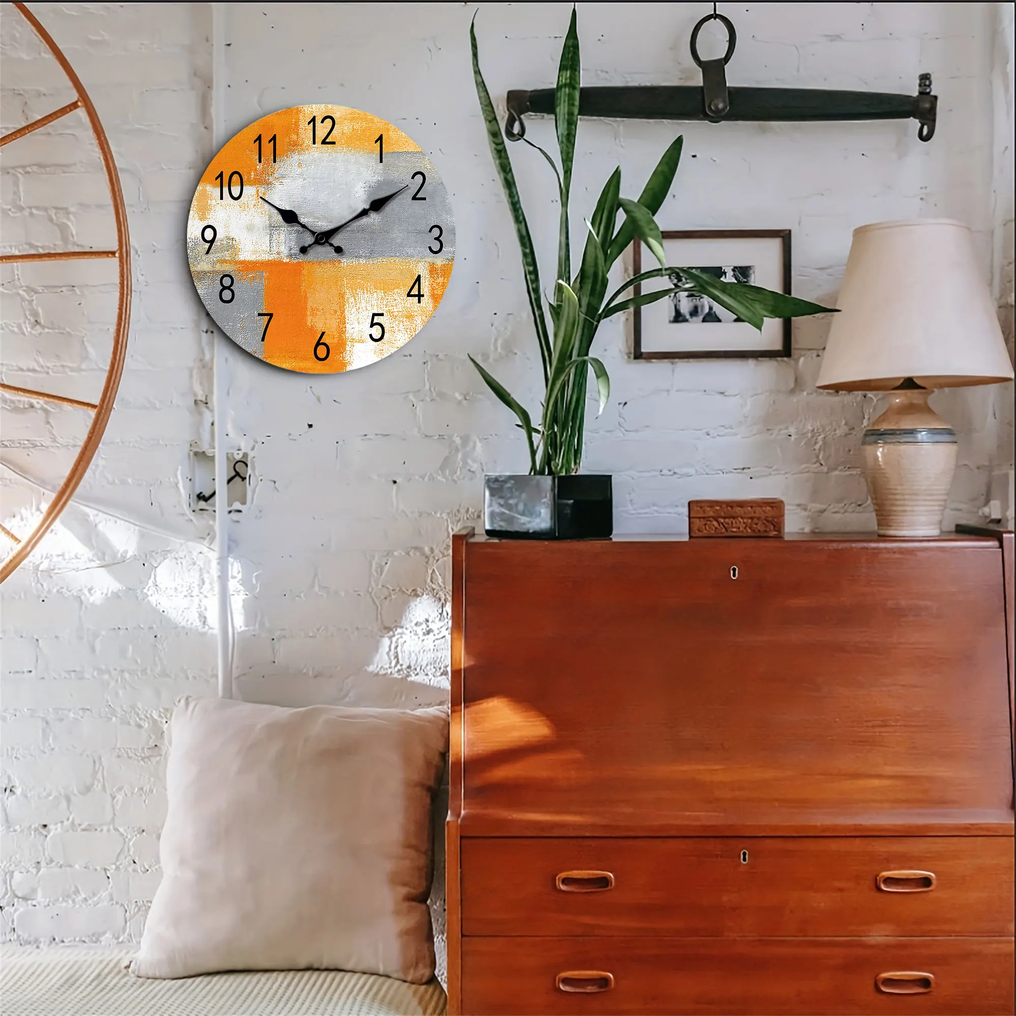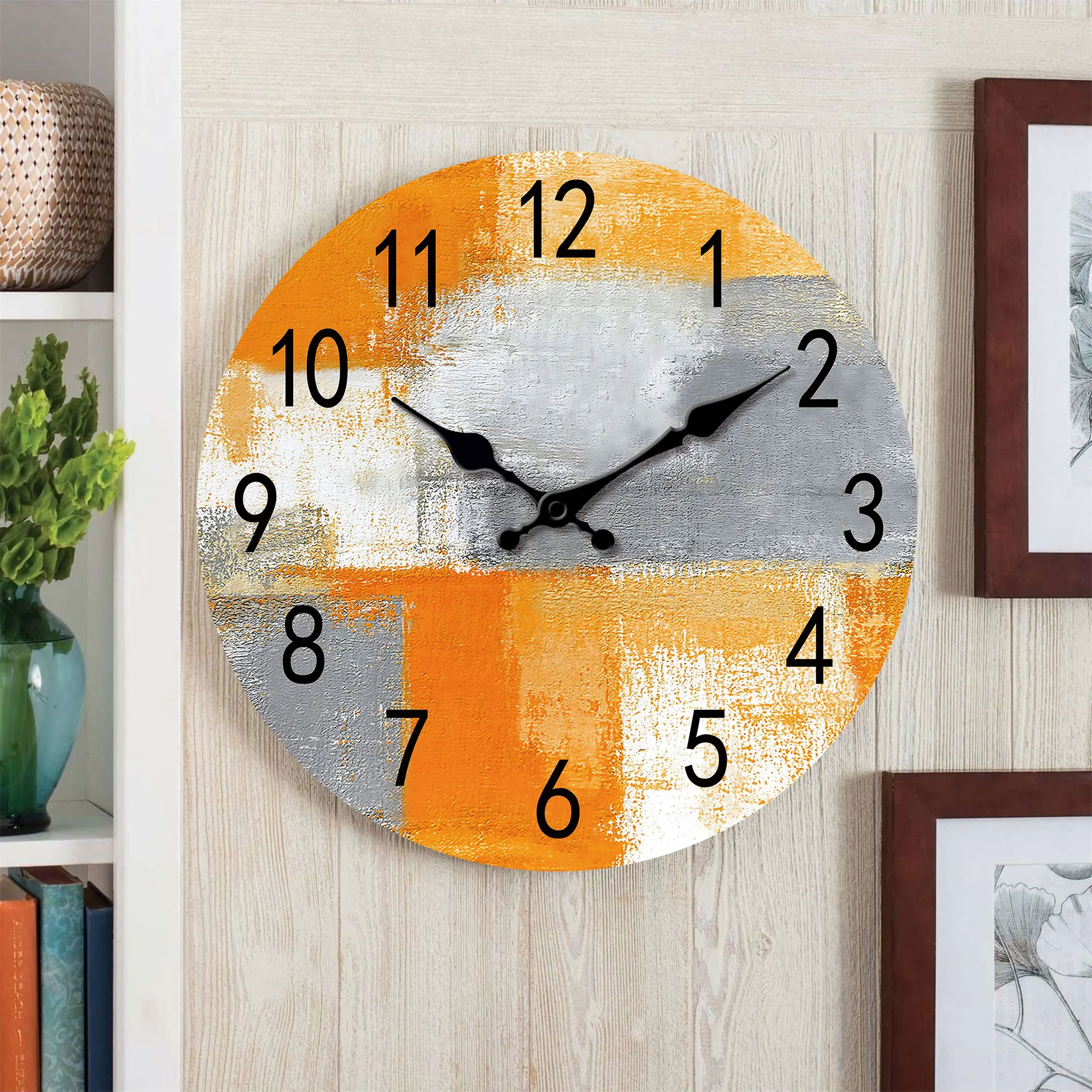 Abstract Orange gray oil painting wall clock, silent non-ticking wooden silent clock, suitable for living room bedroom, room dec
