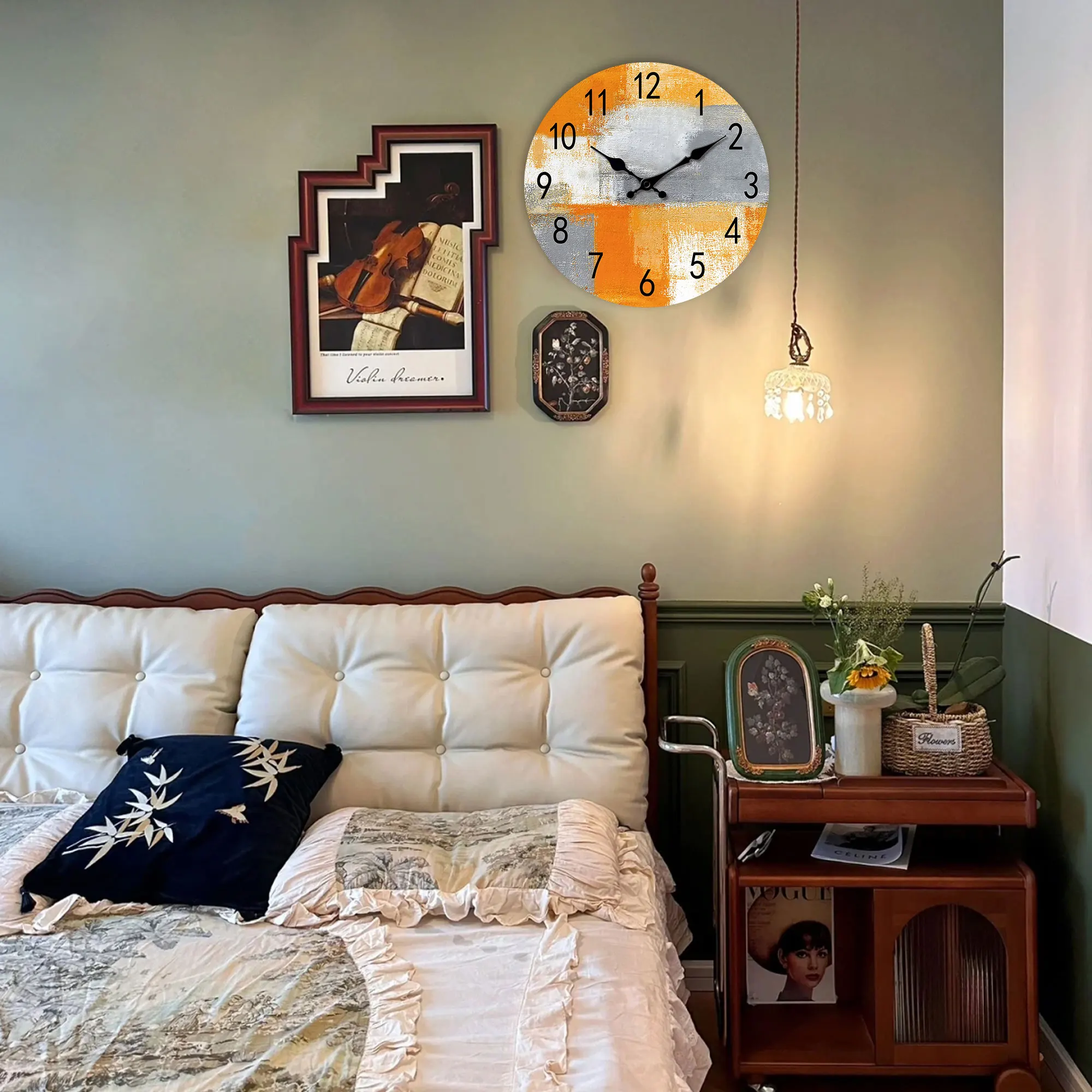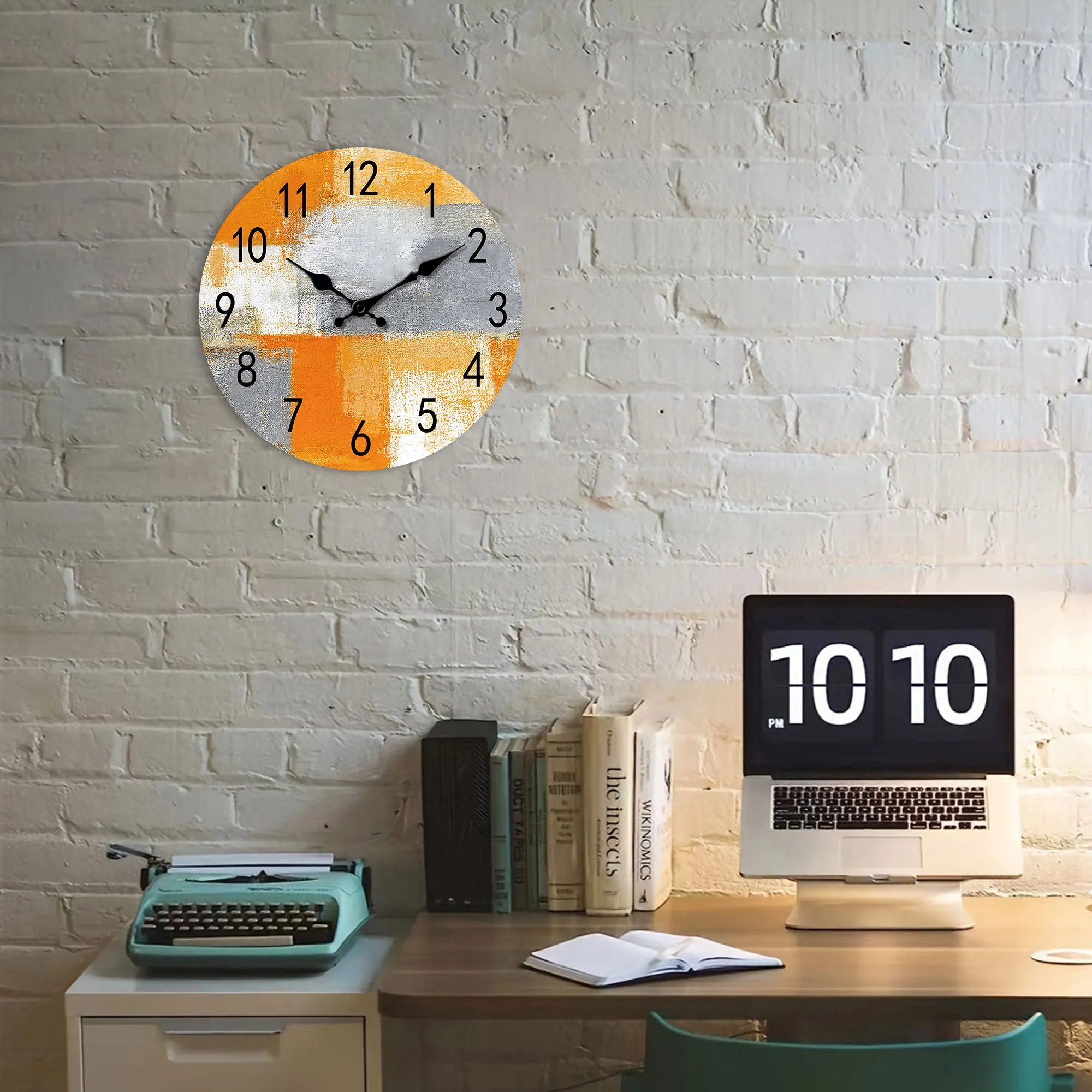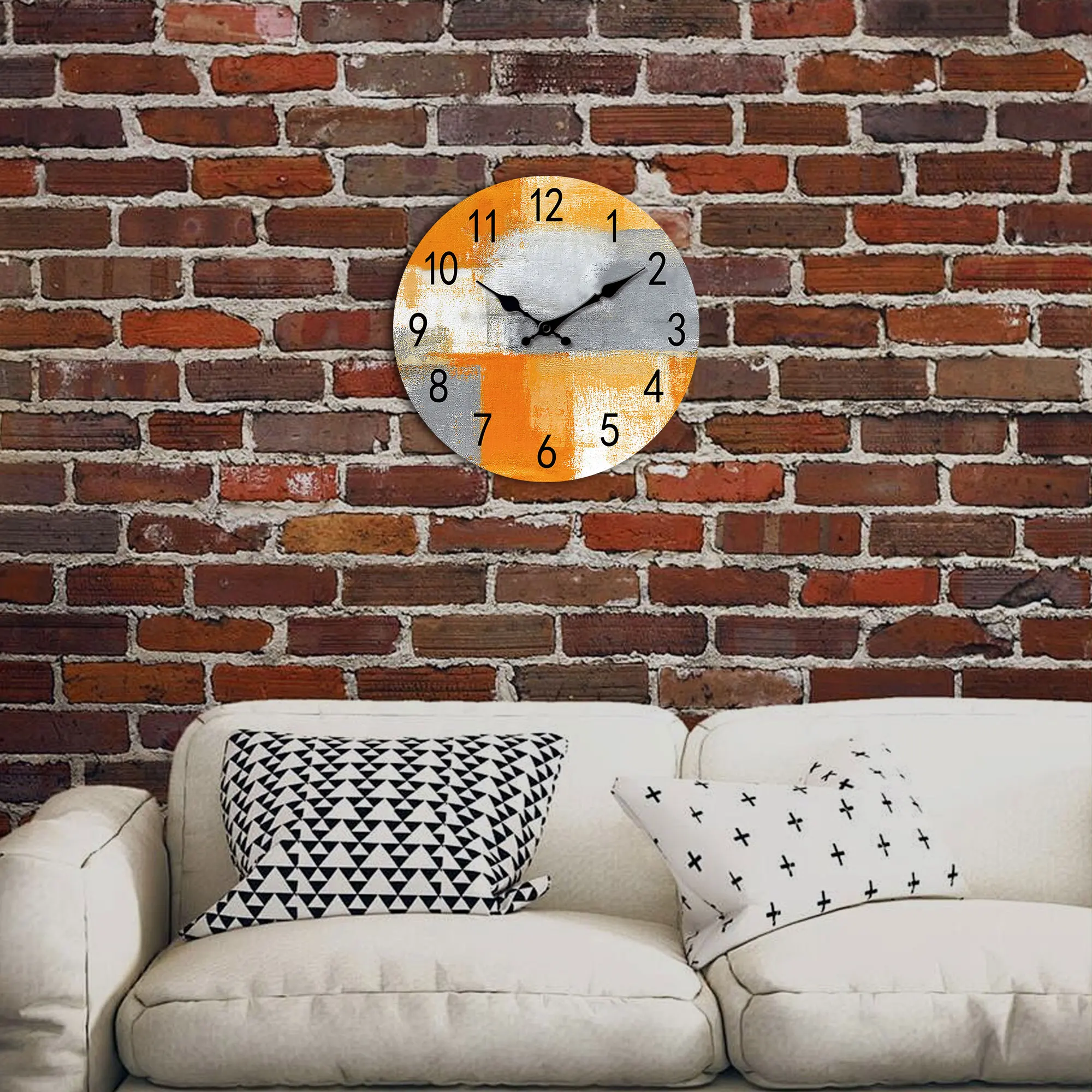 Abstract Orange gray oil painting wall clock, silent non-ticking wooden silent clock, suitable for living room bedroom, room dec