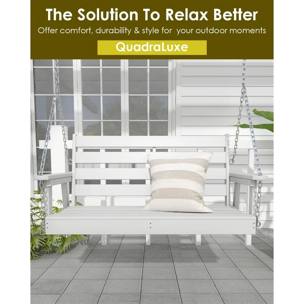 This porch swing is made from high-quality HDPE, a type of plastic that's stronger and more durable than wood. It's designed to withstand all weather conditions without chipping, peeling, cracking, or rotting. The swing features a four-slat backrest and a generous seating area for two people, providing a comfortable place to relax outdoors. It's reinforced with stainless steel strips for added stability and comes with stainless steel chains for hanging. The swing measures 51.5 inches wide, 26 inches deep, and 24.2 inches high, and it can support up to 600 pounds. Assembly is simple with easy-to-follow instructions and basic tools. Maintenance is a breeze; just clean with soap and water to keep it looking new. If you have any issues, our customer service team is committed to resolving them promptly.