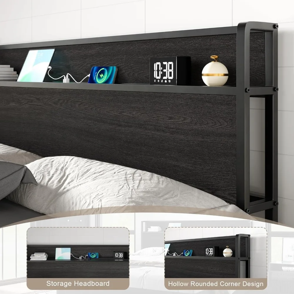 • Chic Headboard: The wooden headboard not only has ample open storage space but also a charging station. Rounded edges & hollow design add a sophisticated touch of the bed frame.