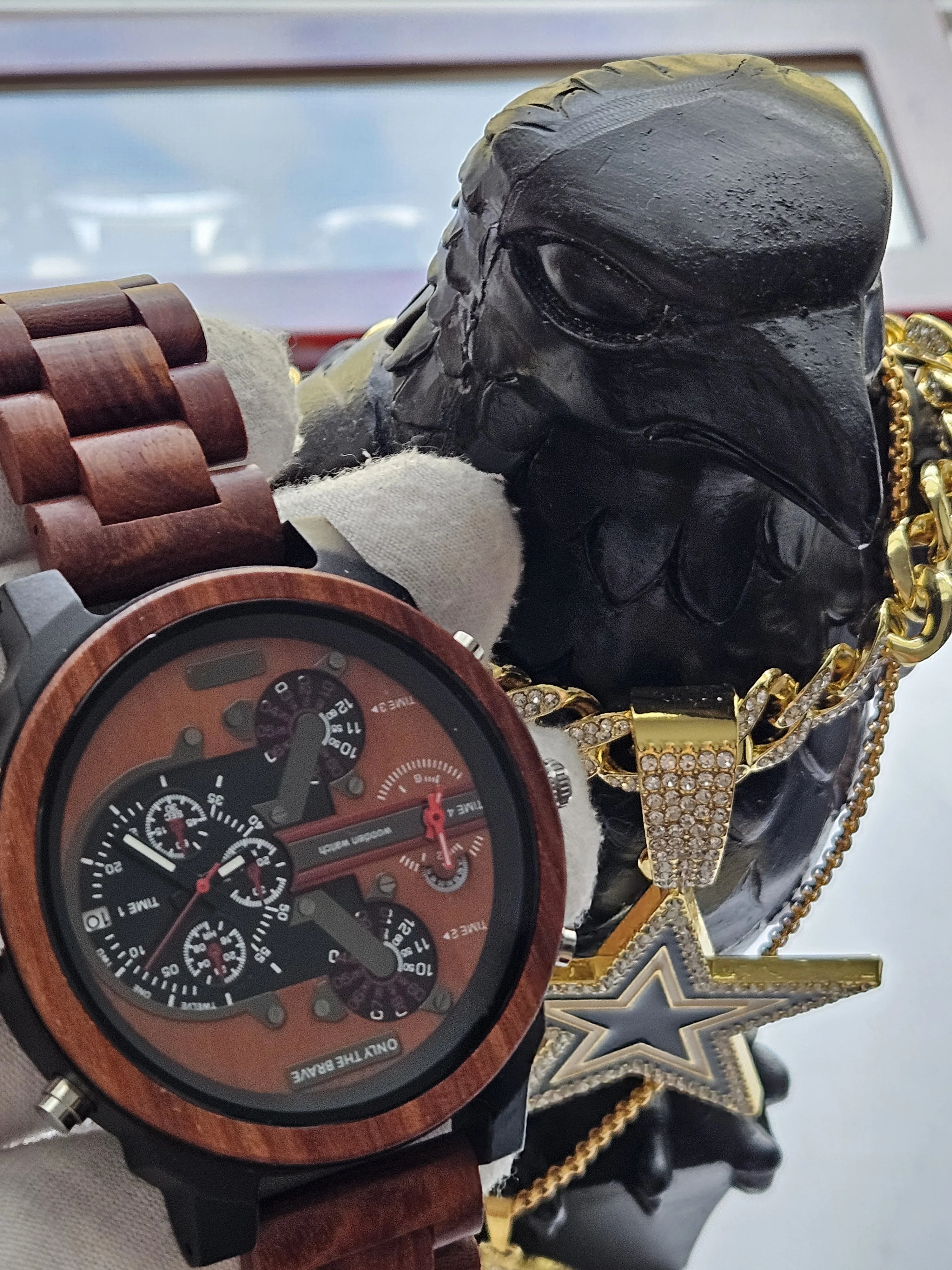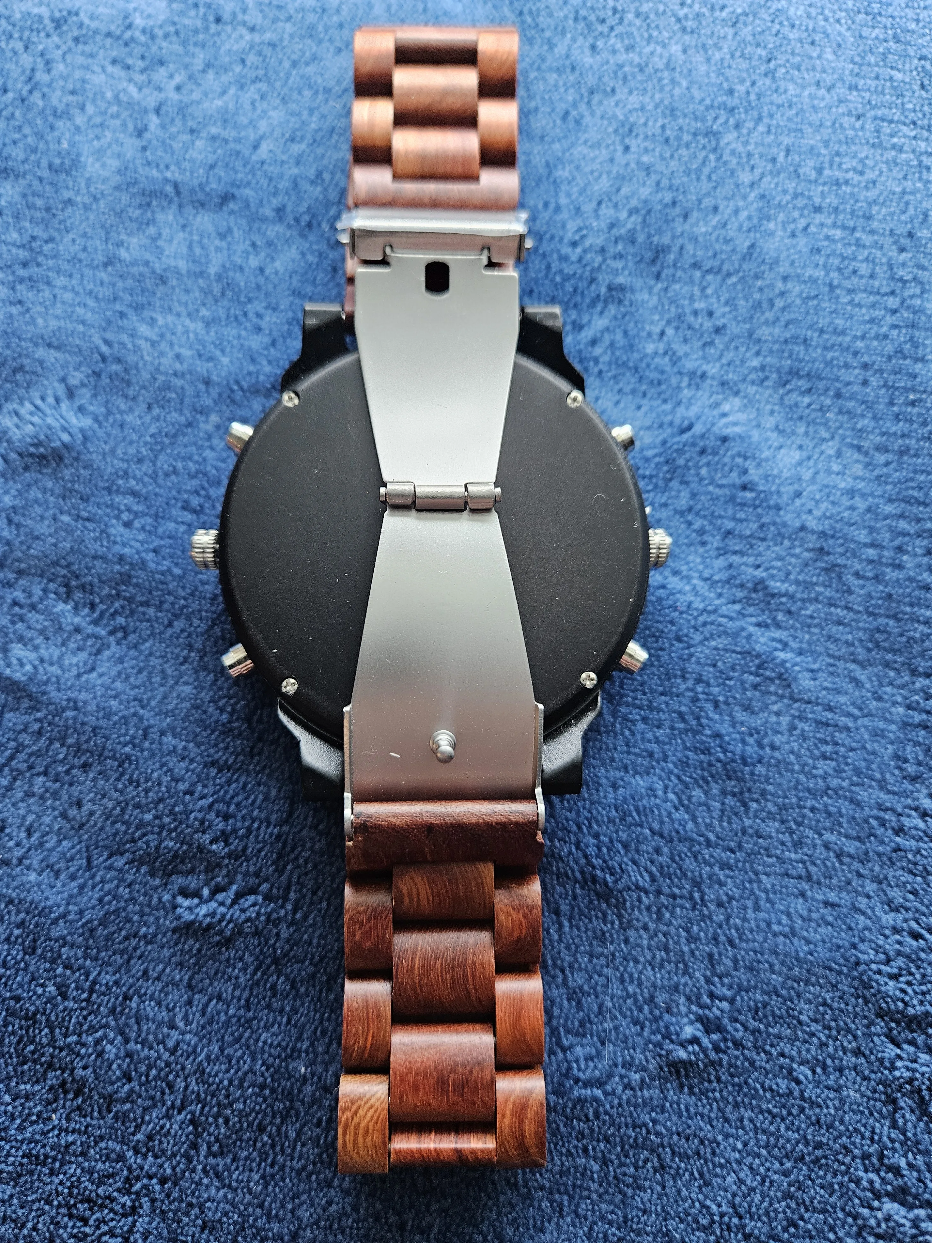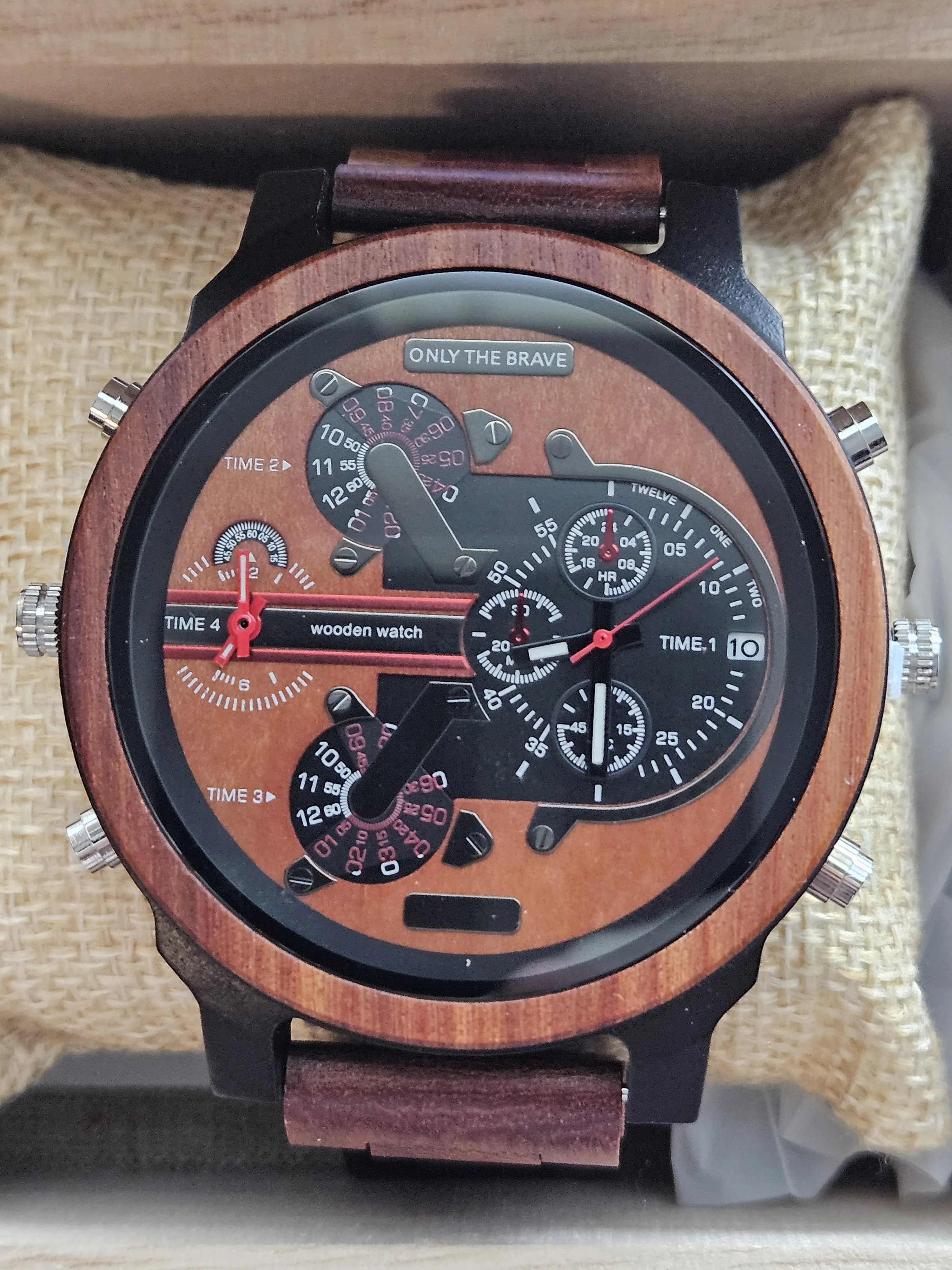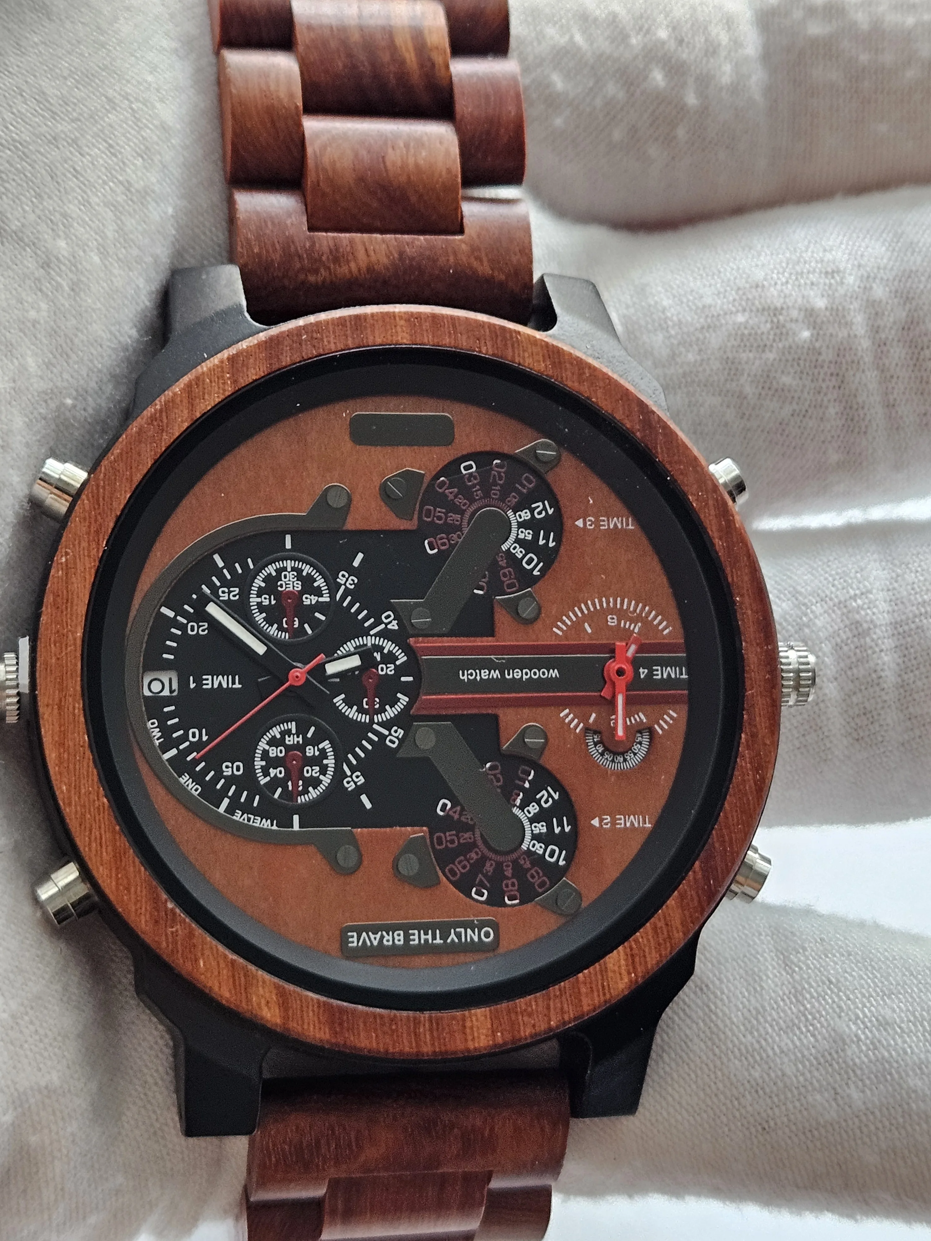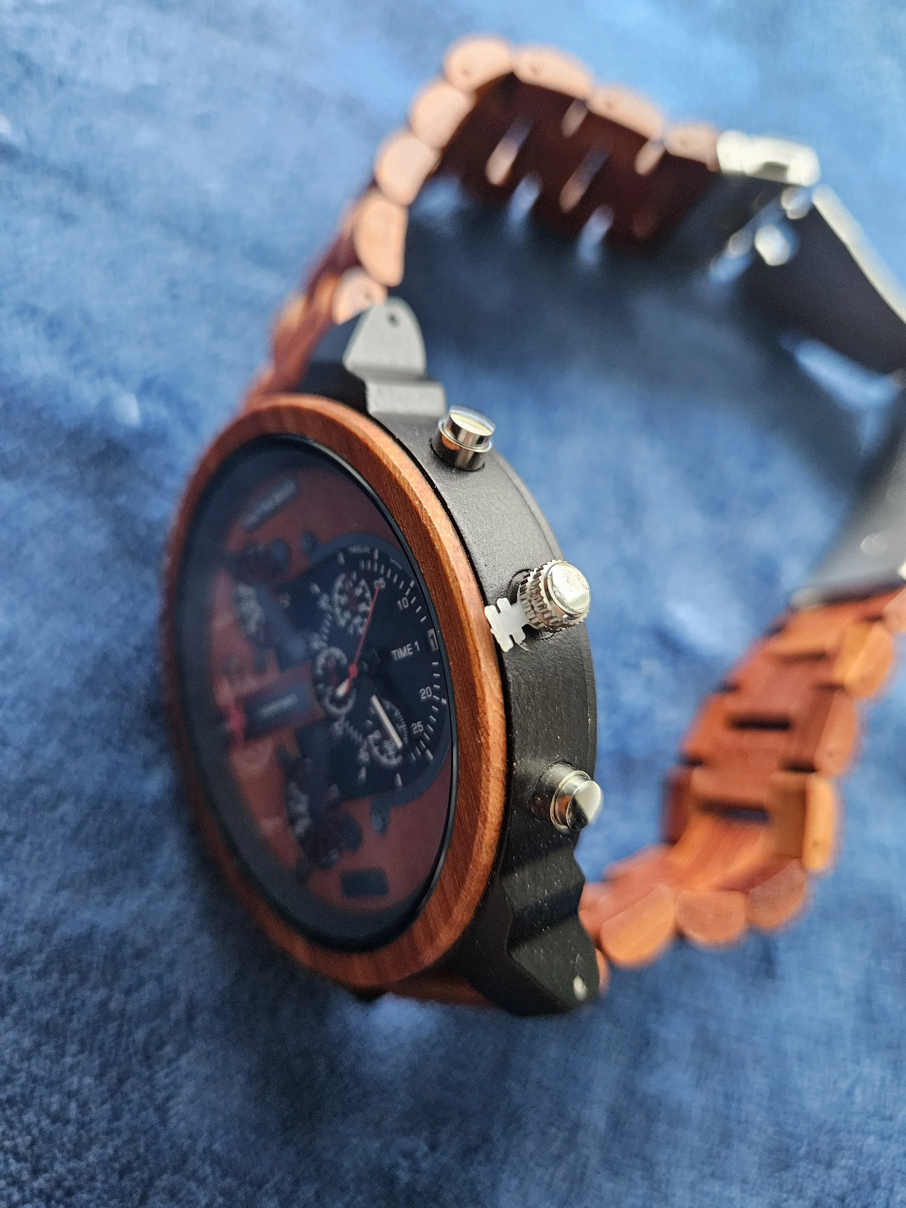 It is a large wood watch. 53cm dial makes a wood chunk for your wrist. I bought this Big Face from Rainch official store, and it arrived two weeks later shipping through the US holidays. Product comes in a wood box with a watch pillow that looks like a grain sack. Tool and instruction are included. IMHO, the box is not worth the extra $3.50. The watch features a quartz driven mechanism. I chose the red sandalwood color. Seller states only two of the dials work. One on the left and one on right. The hands of these dials have the only lumen as well. Pushers are for ornamentation. The cost was $23.09 USD with coins and coupons. There is nothing wrong with the watch. It looks okay. I would not buy it again
