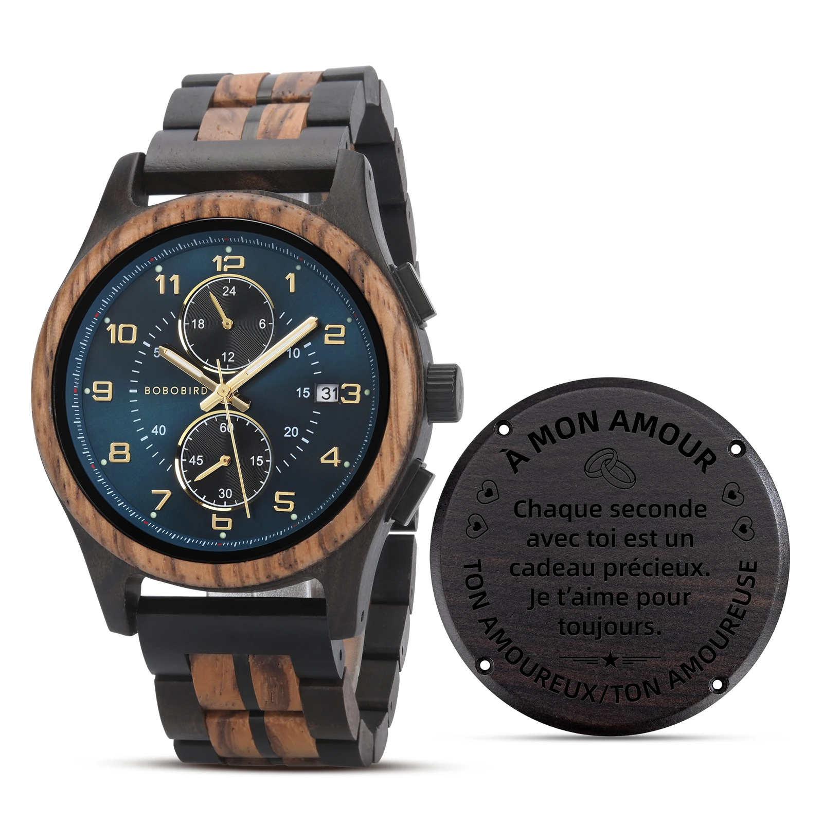 Engraved Wooden Watch, Wooden Watch for Men, BOBO BIRD Watch, Chronograph Wristwatch with Luminous Hands, Custom Wood Watches, Anniversary Gift for Him