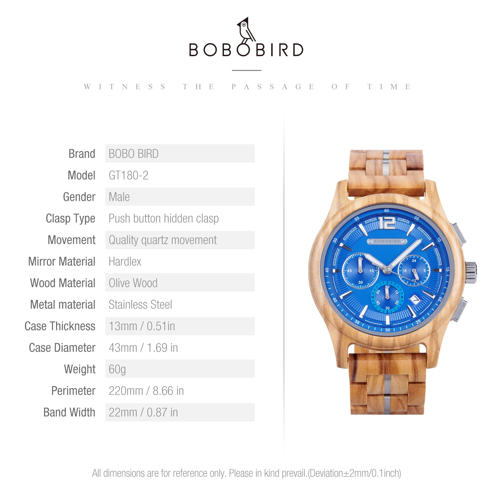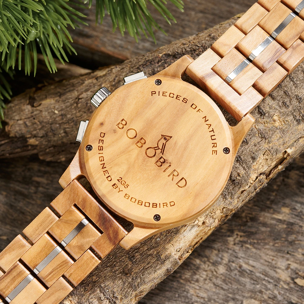 BOBO BIRD Men's Wooden Chronograph Watches – Natural Olive Wood Quartz Timepiece with Multi-function Dials & Gift Box