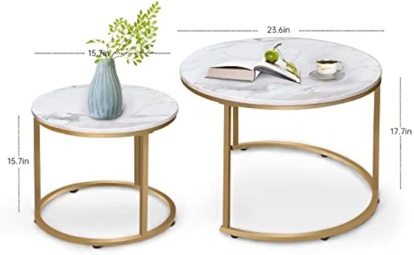 Coffee Table Nesting White Set of 2 Side Set Golden Frame Circular Round and Marble Pattern Wooden Tables, Living Room Bedroom Apartment Modern Industrial Simple Nightstand