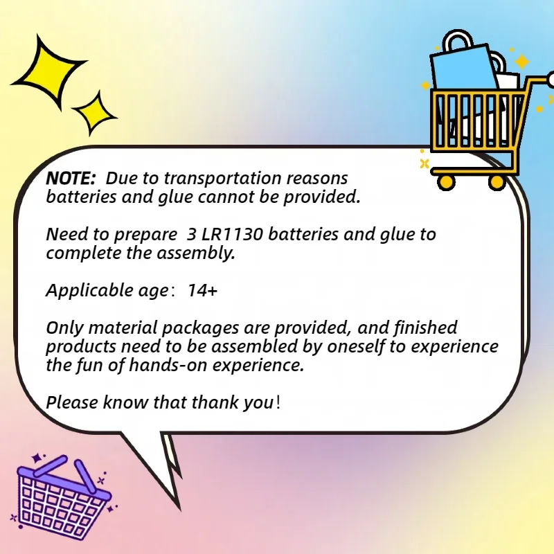 1、Due to transportation restrictions, batteries and glue cannot be provided, you need to prepare batteries and glue to complete the assembly.