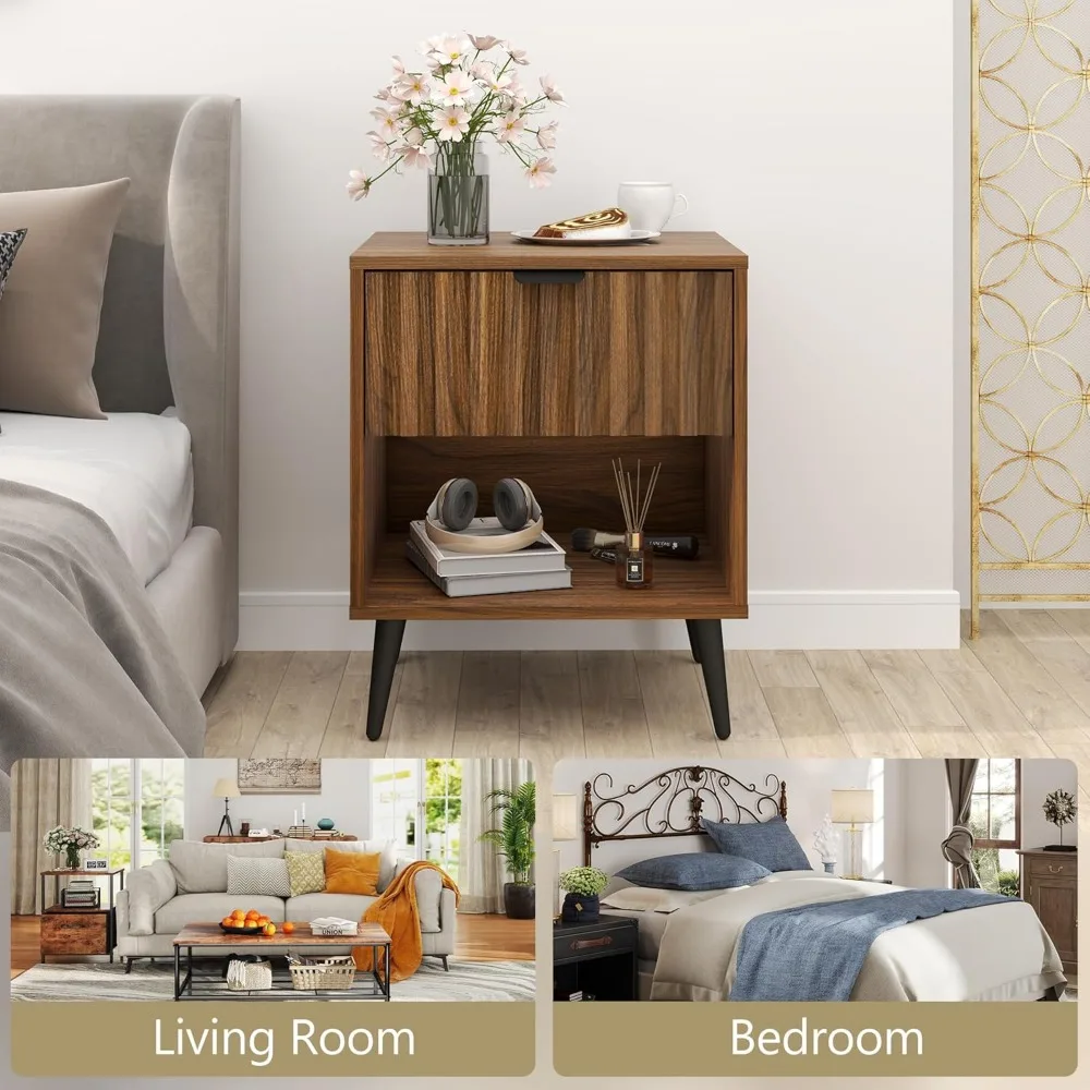 This mid-century modern nightstand offers a harmonious blend of contemporary and natural aesthetics. Its fluted drawer fronts and elegant handle accents contribute to a sophisticated look, enhancing the decor of any bedroom. Measuring 15.8 inches deep, 17.7 inches wide, and 22.3 inches high, this wooden bedside table provides ample storage with one generous drawer and an open compartment for your essentials. Constructed from high-quality wood and featuring sturdy iron legs, this nightstand ensures long-lasting stability and durability. The premium handles and smooth gliding rails facilitate easy access to stored items, while the melamine veneer offers water resistance and protection against minor scratches. Versatile in design, this natural nightstand is suitable for various settings, including bedrooms, living rooms, and offices, adding both function and style to any space. Each package includes all parts, detailed instructions, and tools, well-packed for a hassle-free assembly experience. Should you have any inquiries about our products, our friendly service team is available to assist you within 24 hours of your contact.