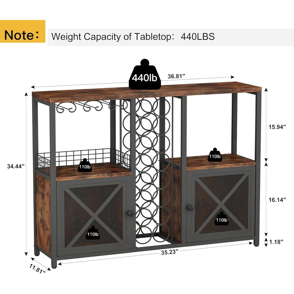 This multifunctional wine bar is designed with a mesh door and a magnetic self-locking mechanism, providing both visibility and ventilation. It is not only ideal for wine enthusiasts but can also serve as a coffee bar station, storage cabinet, sofa console table, or buffet sideboard. Its stylish design complements various home decor styles and can be placed in living rooms, dining rooms, and kitchens. Crafted from a sturdy metal frame and durable wood panels, this wine cabinet offers a weight capacity of over 360lbs. It features adjustable feet to ensure stability on uneven floors. The mesh door allows for easy access to your items and provides ventilation. The door is designed with magnetic suction, which allows for a smooth and secure closure with a gentle push. The wine cabinet boasts a large storage space. The upper section is an open storage area, with a spacious bar top perfect for displaying coffee makers, cups, plates, fruit trays, or decorative items. The top left side of the cabinet is designed to hold glasses, and there's a central bottle rack that can accommodate 16 bottles of wine or beer. The all-in-one design includes a wine glass holder, cup holder, wine rack, and storage shelves, providing ample space to organize your wine collection. The cabinet measures 37 inches in depth, 11.8 inches in width, and 34.6 inches in height. The wine cabinet features a unique design that combines beautiful rustic wood grain with clean lines and a black metal frame, blending modern and retro industrial styles. The center of the cabinet is designed for wine storage, making it both visually appealing and convenient for accessing red wine. The large storage spaces on both sides can hold wine barrels and various sizes of wine, with sorting options on either side. This furniture-style wine rack is perfect for showcasing glasses, wine, coffee machines, and cups. Assembly is made easy with this wine cabinet, designed for liquor and glasses. Detailed instructions and all necessary accessories are provided for a quick and hassle-free assembly process.