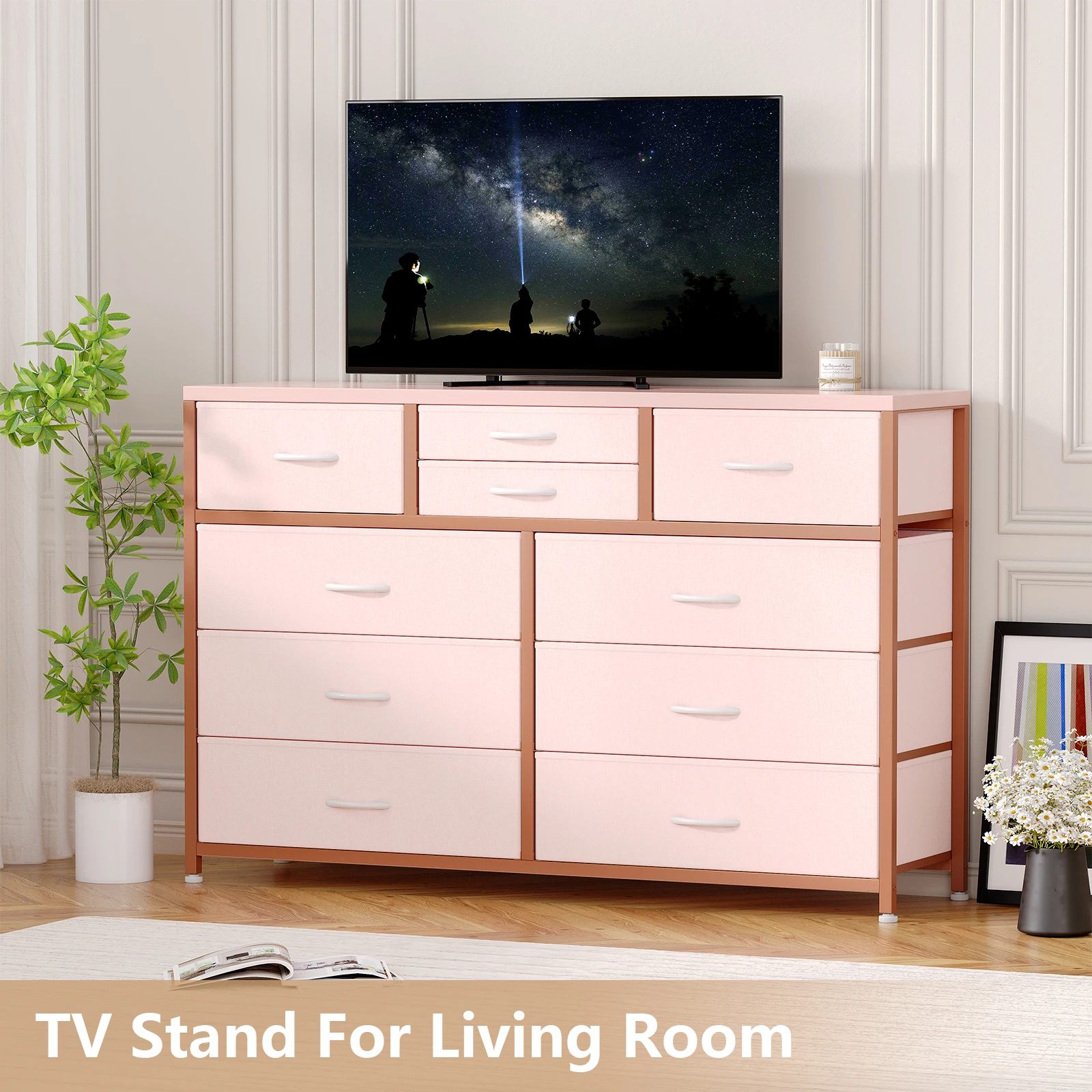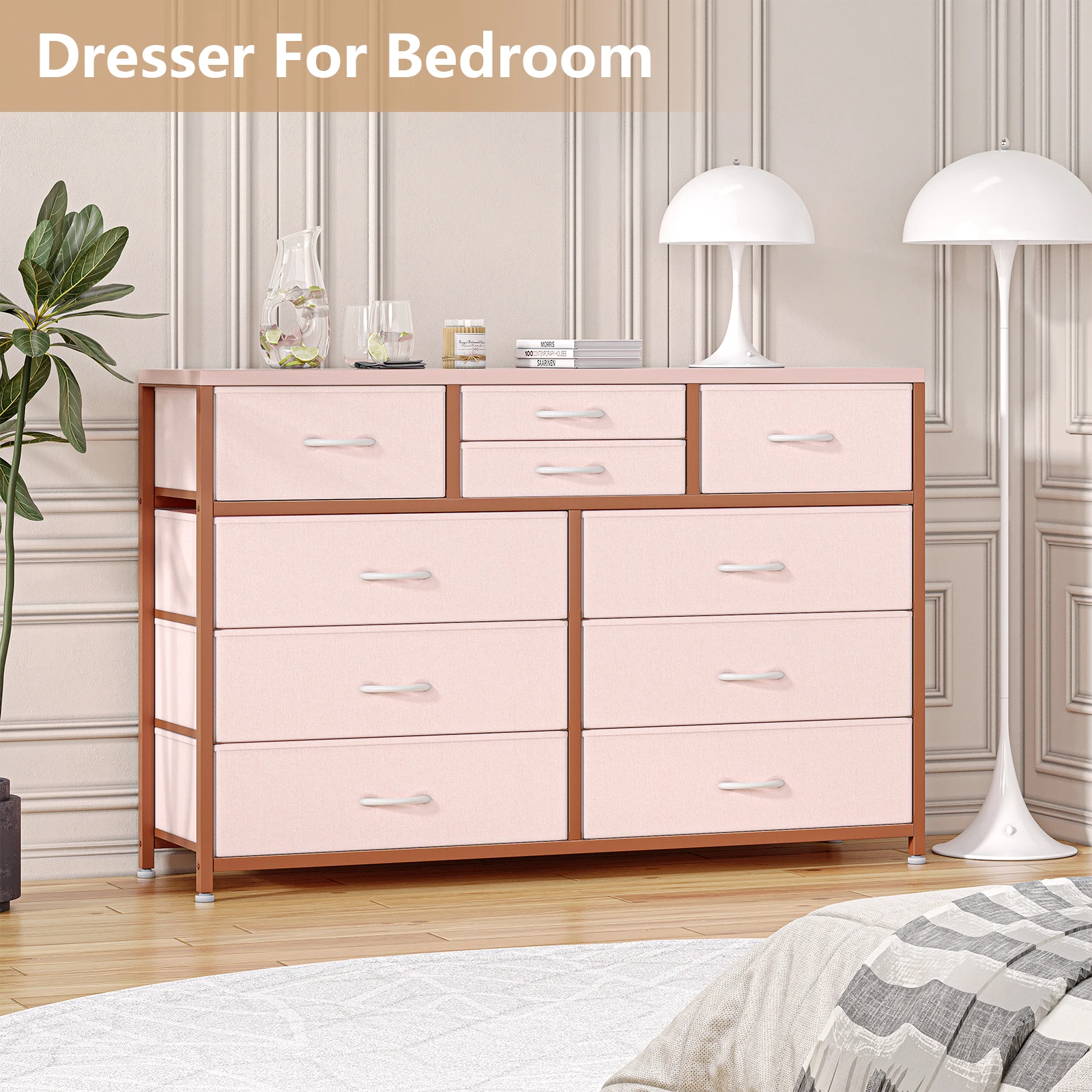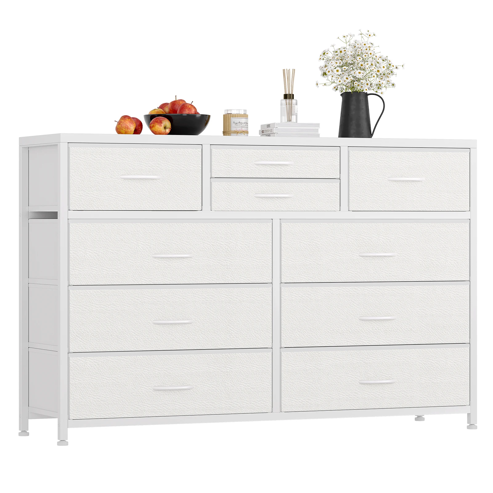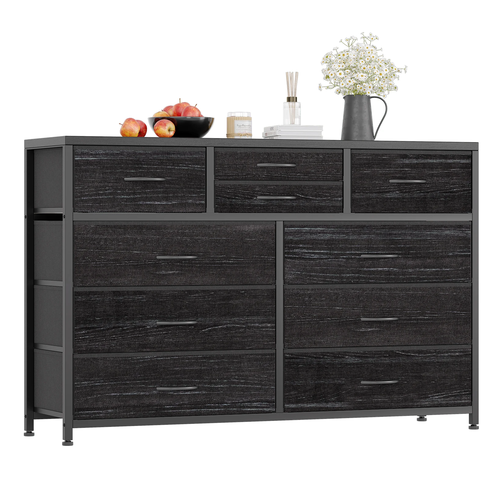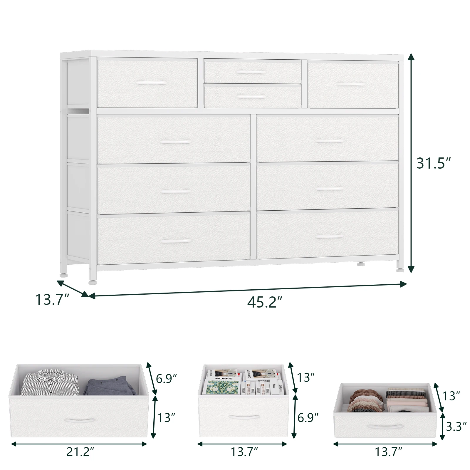 【10-Drawer Storage System】This versatile dresser features 10 deep fabric drawers (6 large, 2 medium, 2 small) for optimal organization. The large drawers (21.2"L×13"D×6.9"H) store bulkier items, while the unique small drawers (13.7"L×13"D×3.3"H) perfectly separate socks, underwear or accessories. With 45.3"W×13.8"D×31.5"H dimensions, it offers substantial storage capacity while maintaining a space-saving profile.