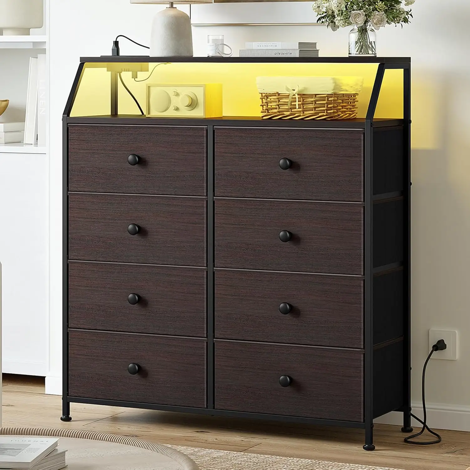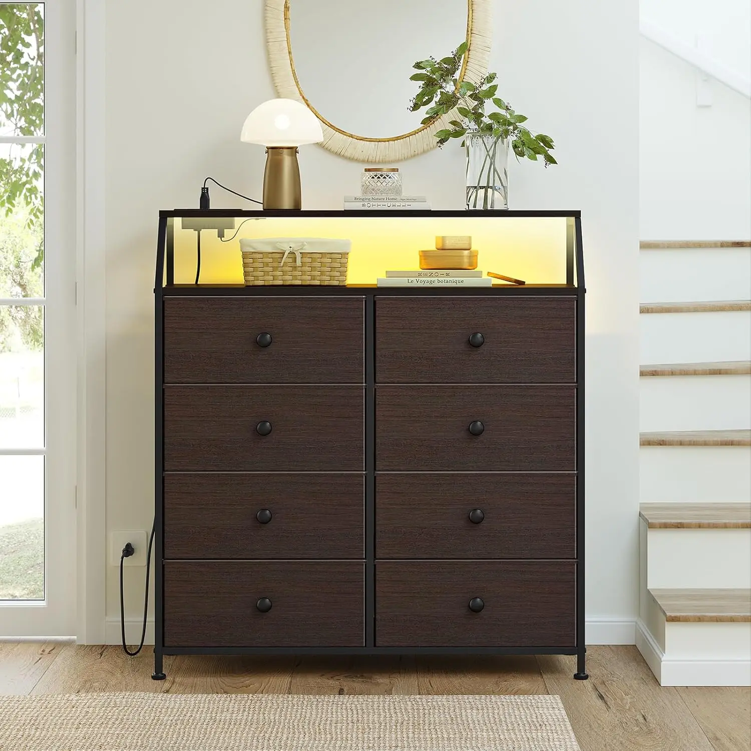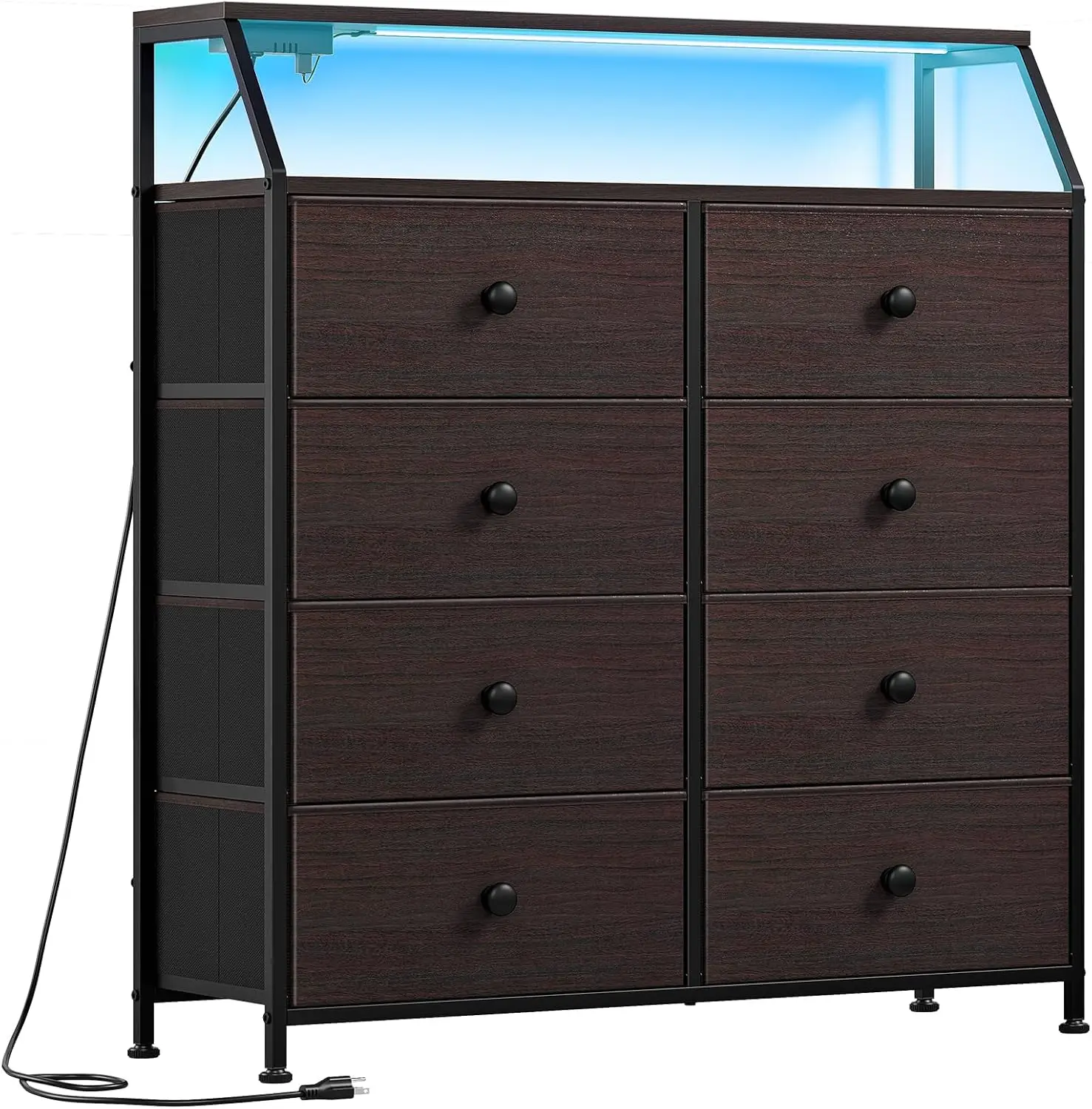 Dresser for Bedroom with Charging Station and LED Lights, Brown Tall Chest of Drawers with Shelf, 2Pcs Wooden Top, Large Storage Organizer Unit for Closet, Living Room, Entryway