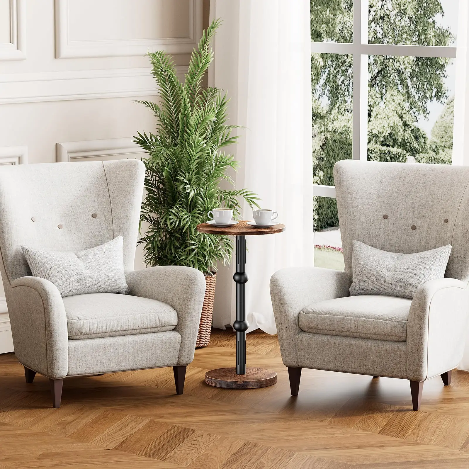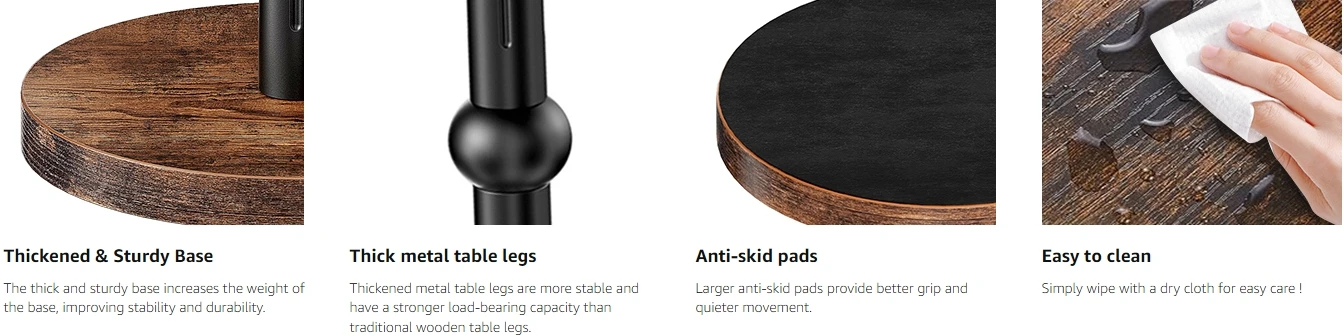Round Side Table: This small side table features a retro design with thick metal legs, creating a captivating visual style. The thickened base ensures exceptional stability. The vintage-inspired wood grain tabletop, with its easy-clean surface, enhances room décor and ambiance, perfectly complementing rustic interiors.