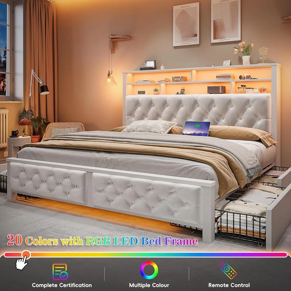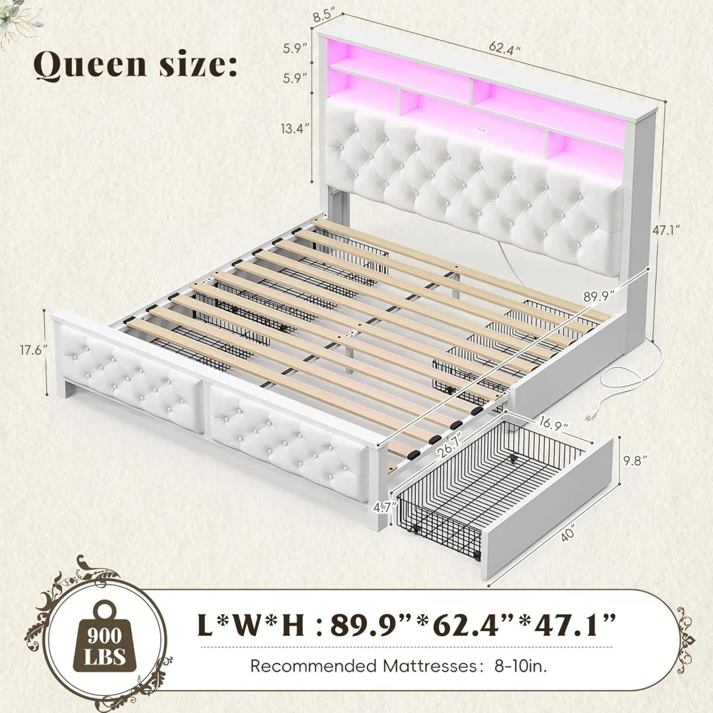 • 【Smart Storage Solutions】The queen bed frame with Headboard combines style and organization with four large side storage drawers. The 47"H tall headboard offers five open compartments for books, decor, or electronics, providing breathable support through soft, skin-friendly material and high-density padding.