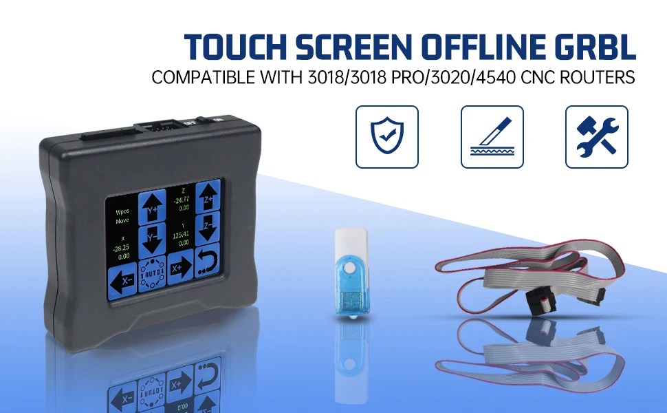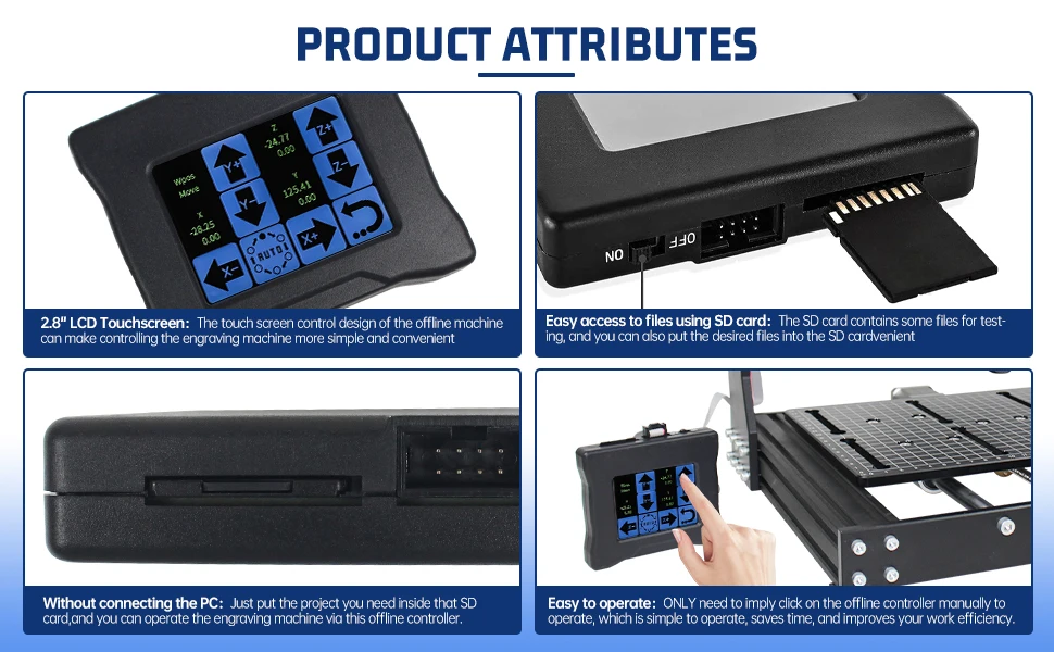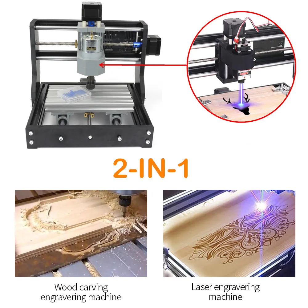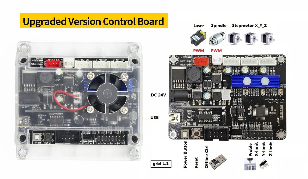 Body usedprofilesand plastic, small size, light weight, USB interface, GRBL control system, learning, entry preferred. Can use carving knife, but also can use laser engraving.