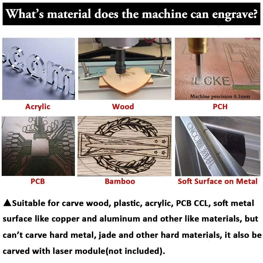Can engrave plastic, wood, acrylic, pvc, pcb, wood and the other similar material.
