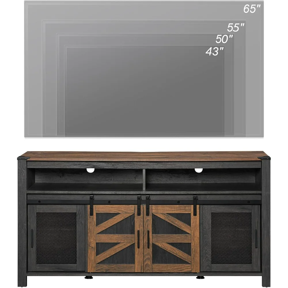 - Farmhouse TV Stand for 65 Inch TVs: This entertainment center measures 59" W x 15.35" D x 31" H, which supports 43/50/55/65 Inches flat screens easily. This wood tv console table design with a special barn-door pattern on the sliding doors and the visual mesh on the side doors, as well as the rustic metal corner decoration on two corners of the tabletop, brings the atmosphere of a Farmhouse&Rustic to your bedroom and living room.
