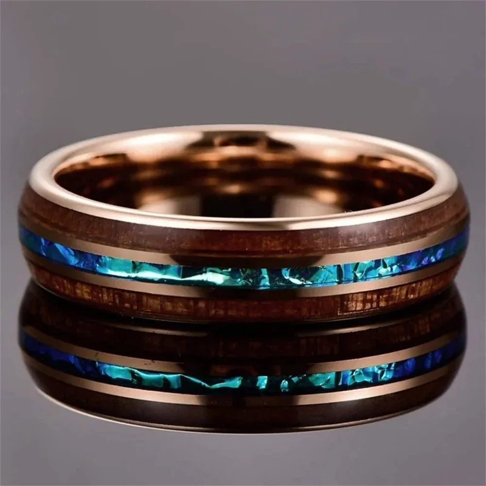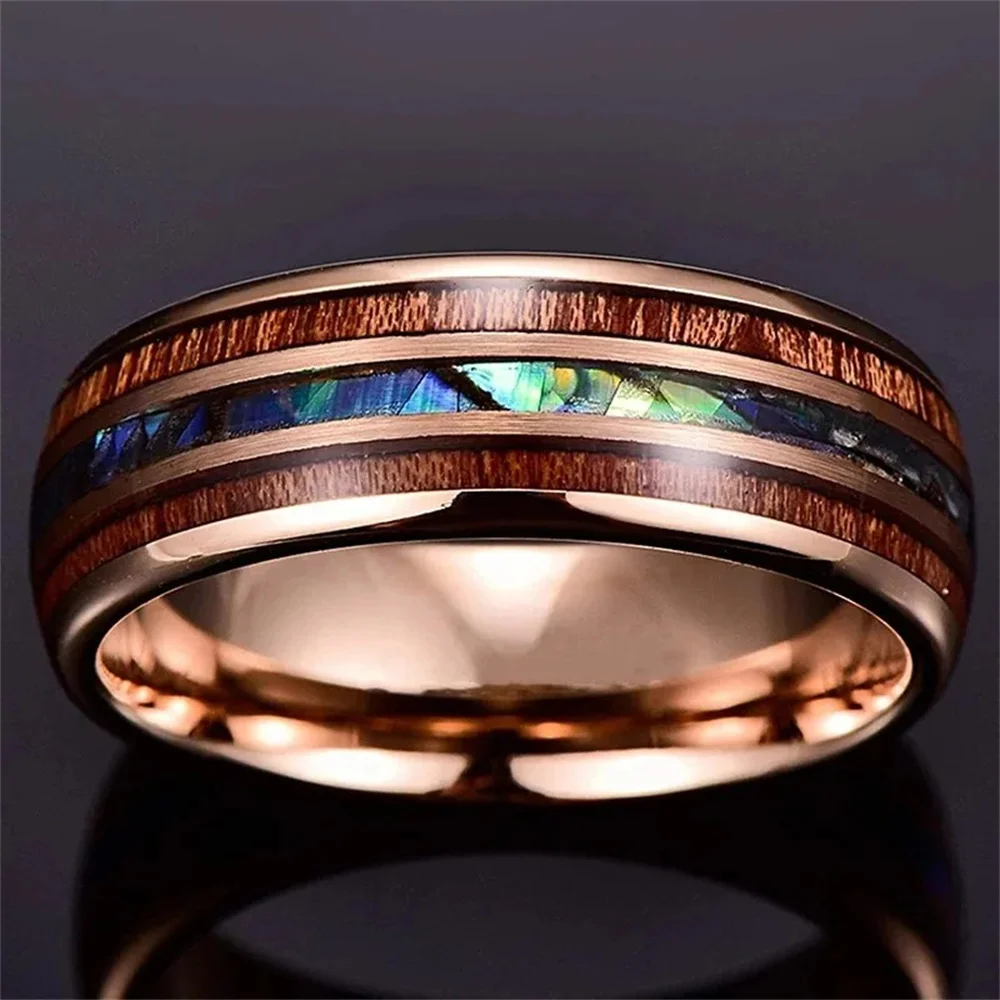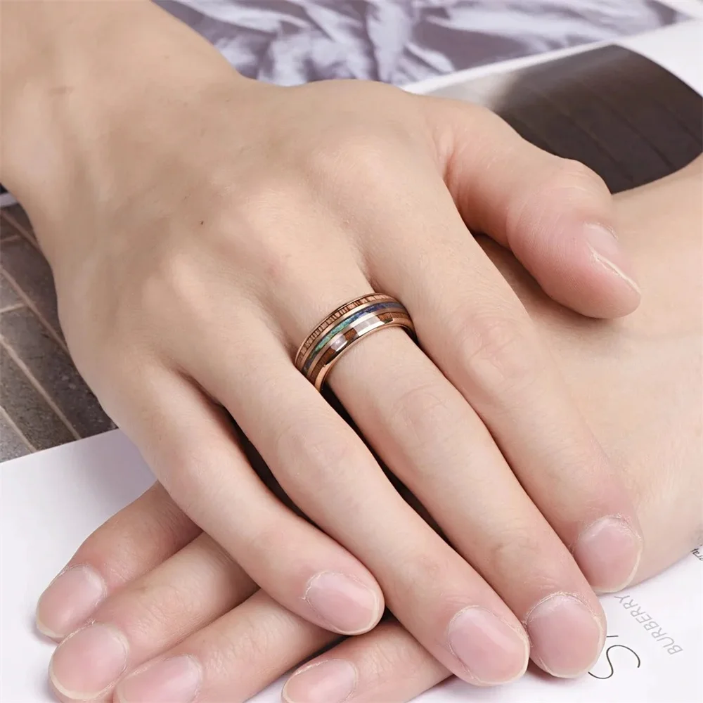 Fashion 8mm Men Rose Gold Color Stainless Steel Rings Inlay Hawaiian Koa Wood and Abalone Shell Rings For Men Wedding Jewelry