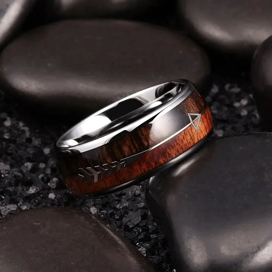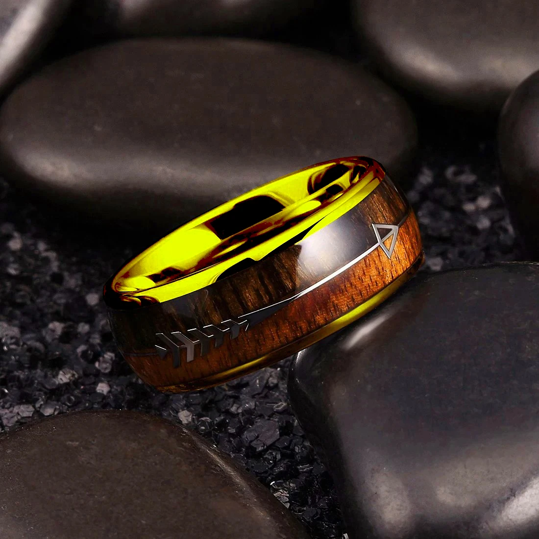 Fashion 8mm Silver Color Stainless Steel Arrow Rings for Men Women Inlaid Hawaiian Koa Wood Rings Men Wedding Band Jewelry Gifts