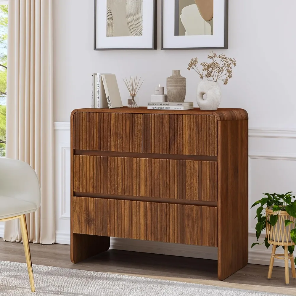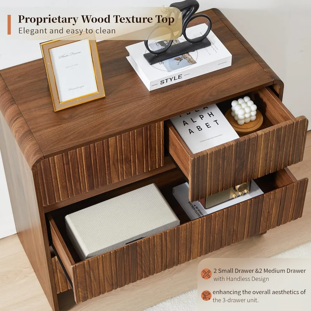 Sleek & Modern Design: Elevate your home décor with this wood 3 Drawer Dresser , where contemporary elegance meets functional simplicity. The hidden handle design delivers a seamless, clutter-free aesthetic, while the gently rounded edges softens sharp edges—adding a refined touch that enhances both safety and sophistication. Crafted with wood-grain finishes and fluted panel detailing, this dresser effortlessly complements modern, contemporary, or transitional interior styles, making it a versatile addition to any space.