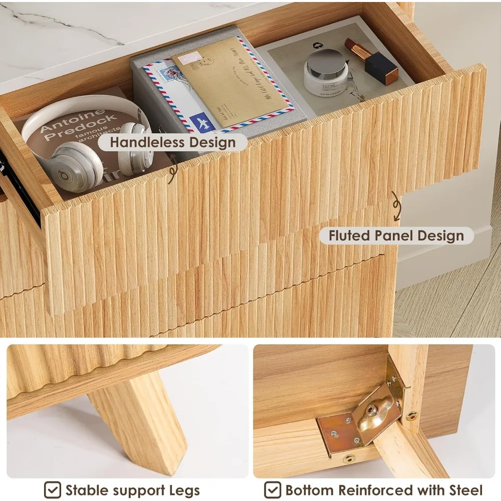 - 【Fluted 6 Drawer Dresser】This solid wood dresser boasts a grooved drawer panel paired with an off-white artificial marble top, emanating an aura of sophistication. Its smooth, curved edges not only elevate its elegance but also create a safe environment. Measuring 52" L x 15.8" W x 31.4" H, this dresser seamlessly blends aesthetic appeal with exceptional functionality.
