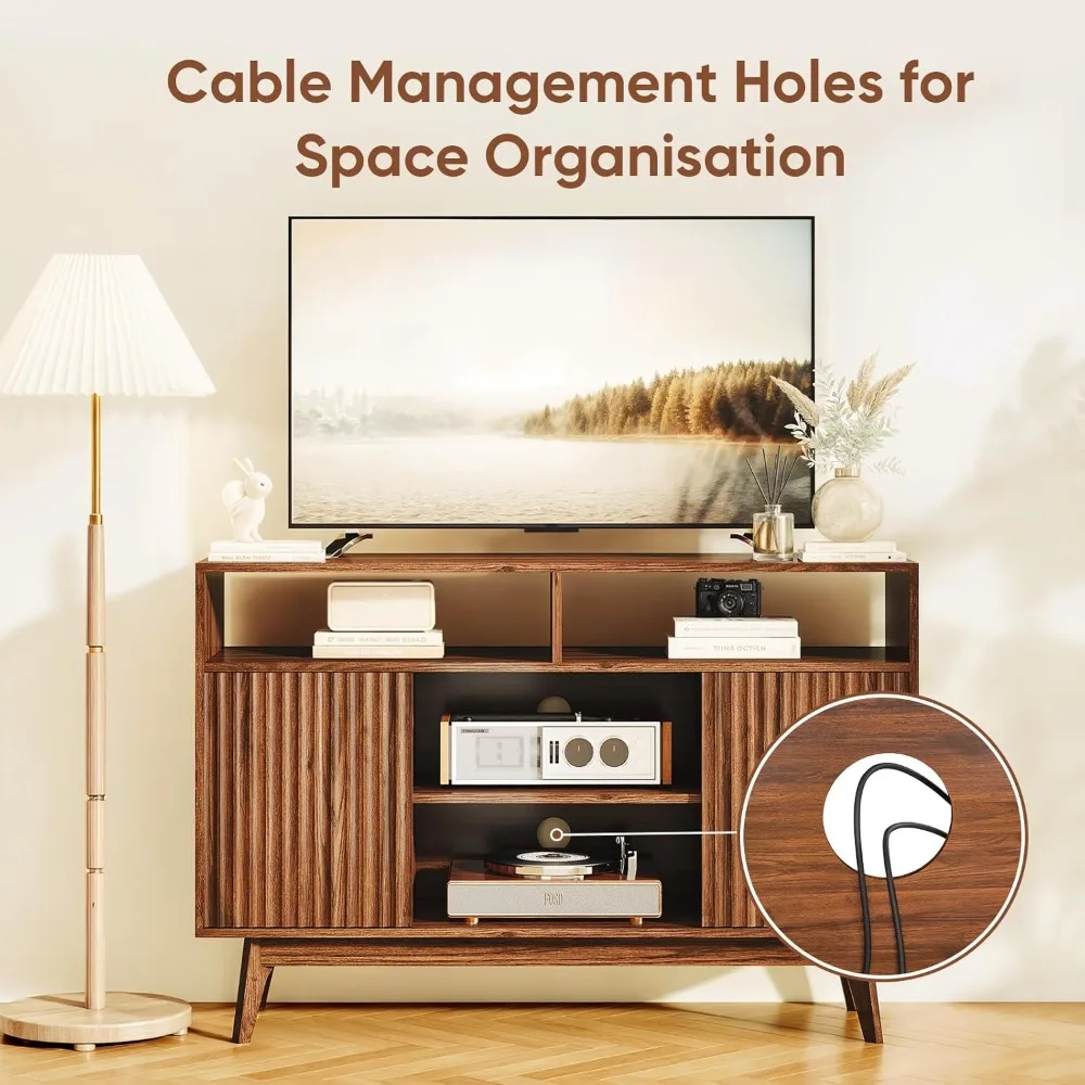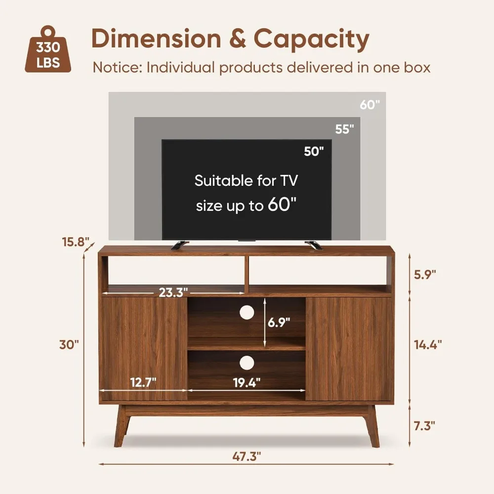 - Multifunctional TV Console - This tall TV stand is cleverly designed to provide versatile storage space to meet the various needs of modern families. The TV stands has a large desktop (47.3"W)that can support a 50/55/60 inch TV, equipped with 4 open shelves (5.9"-6.9"H) and 2 hidden storage spaces which provides ample storage space and combines beauty and practicality. In addition, the TV cabinet body is also designed with 2 cable management holes to help effectively organize the cables of the TV and other electronic devices. Whether it is storage or display, this living room TV stand can provide a perfect solution