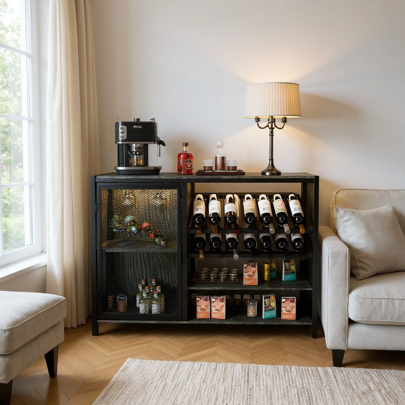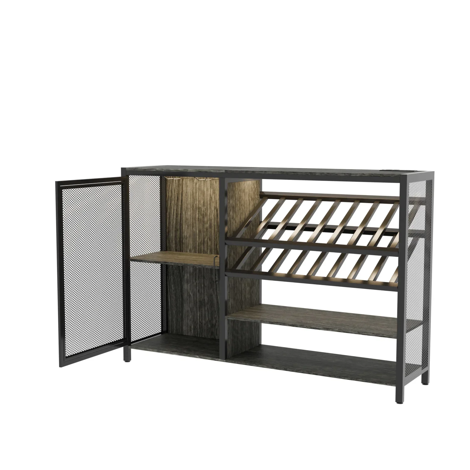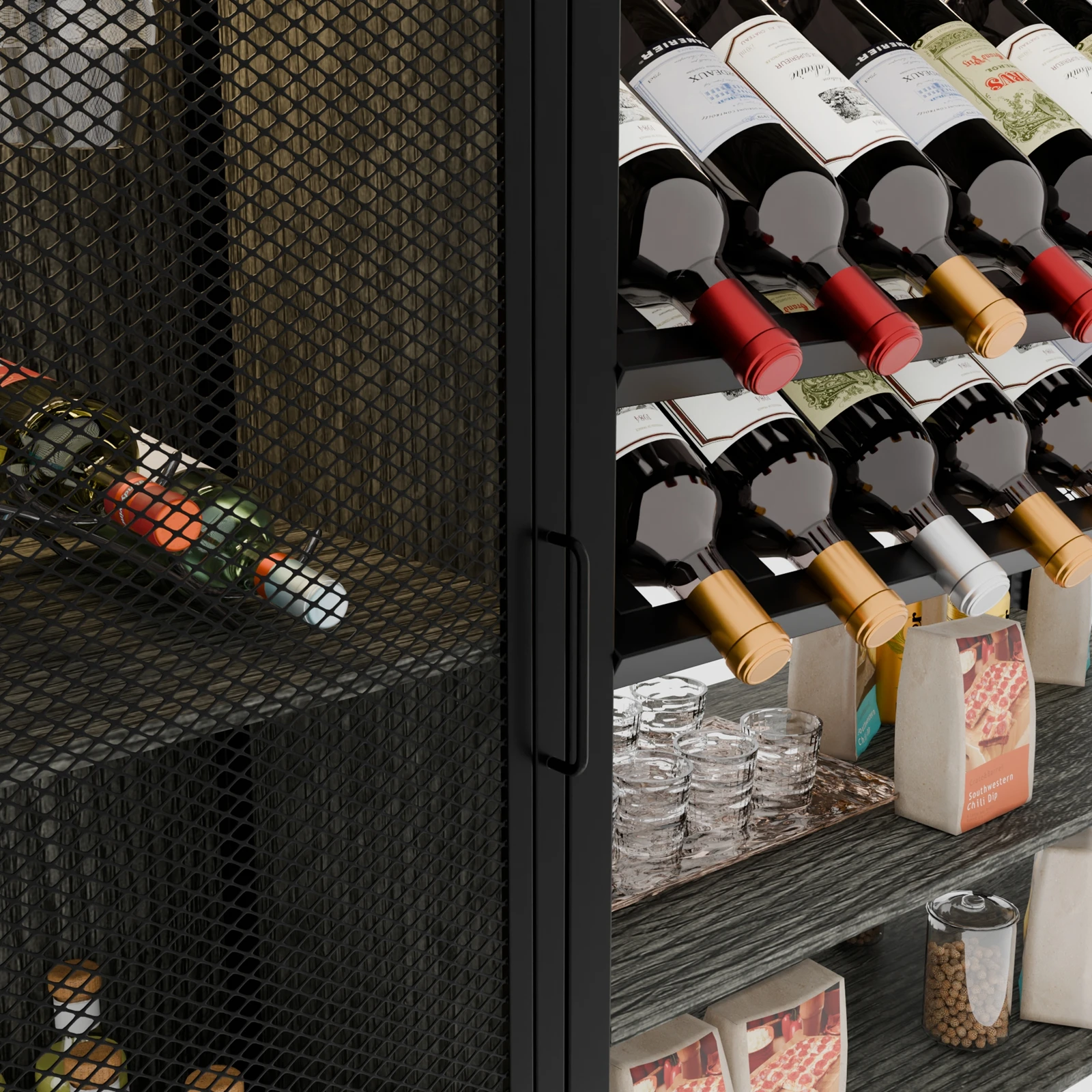 Spacious Mesh-Door Display Cabinet: One side features our innovative mesh-door design, providing optimal visibility and air circulation for your collection. The shelving system accommodates various glassware sizes, from delicate champagne flutes to robust red wine glasses. The reinforced wooden shelves ensure stability, while the mesh panels offer a modern aesthetic that beautifully displays your finest stemware and bottles.