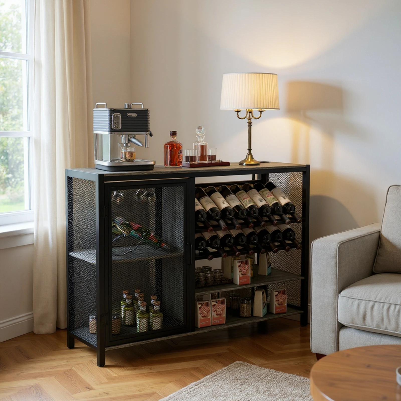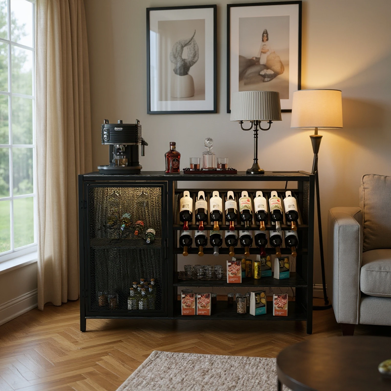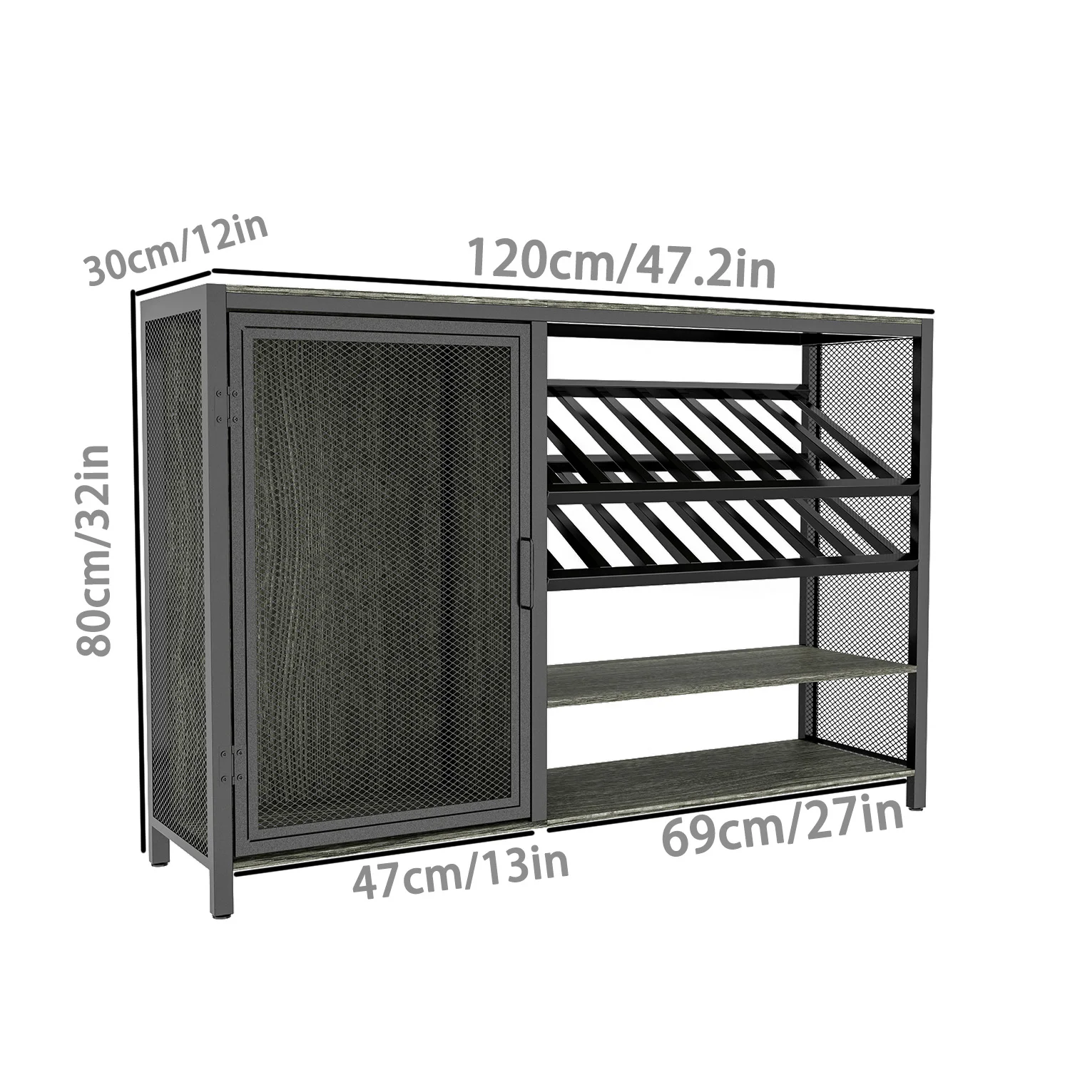 Spacious Mesh-Door Display Cabinet: One side features our innovative mesh-door design, providing optimal visibility and air circulation for your collection. The shelving system accommodates various glassware sizes, from delicate champagne flutes to robust red wine glasses. The reinforced wooden shelves ensure stability, while the mesh panels offer a modern aesthetic that beautifully displays your finest stemware and bottles.
