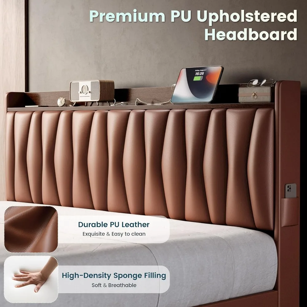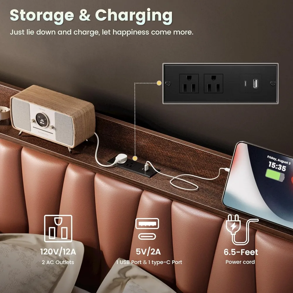 - Charging & Storage 2-in-1: King Platform bed frame with storage headboard and built-in charging station, including 2 AC outlets, 1 USB and 1 Type-C port, convenient for charging different models of electronic devices and put frequently used items.