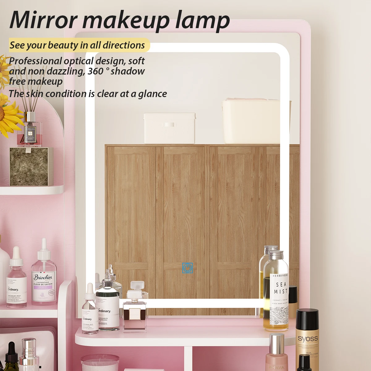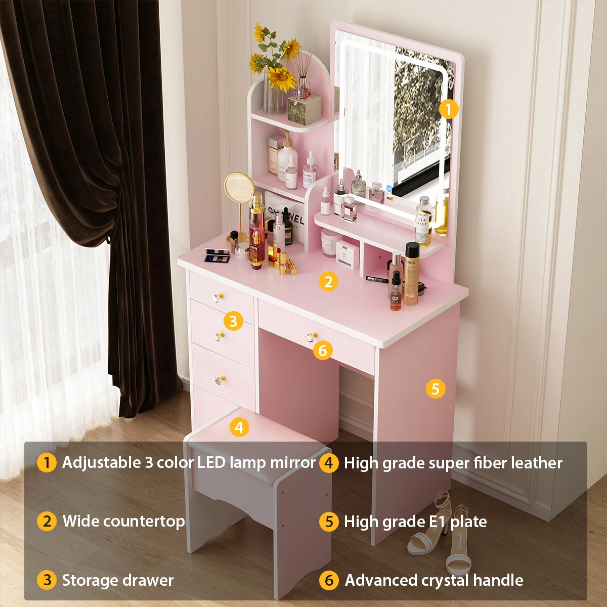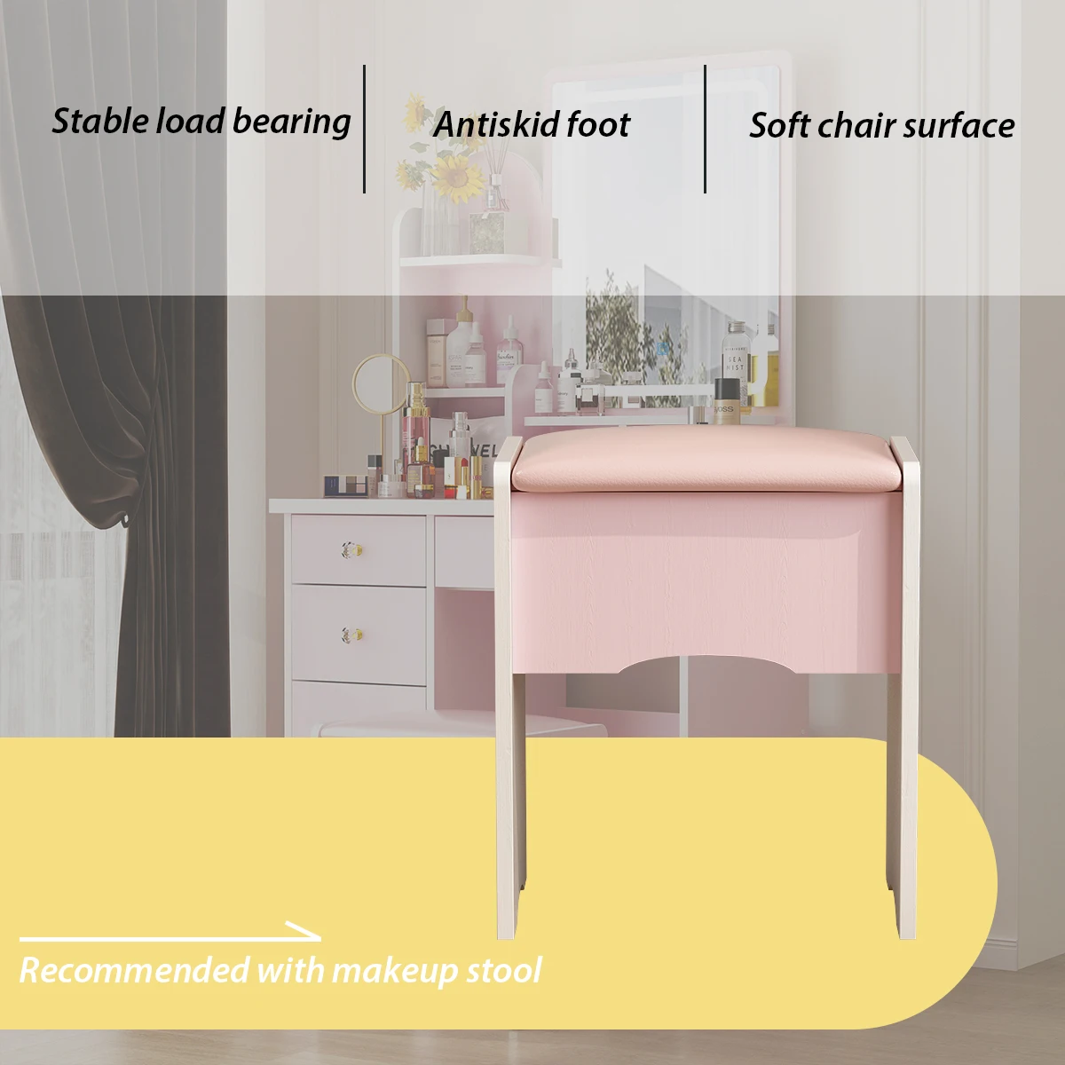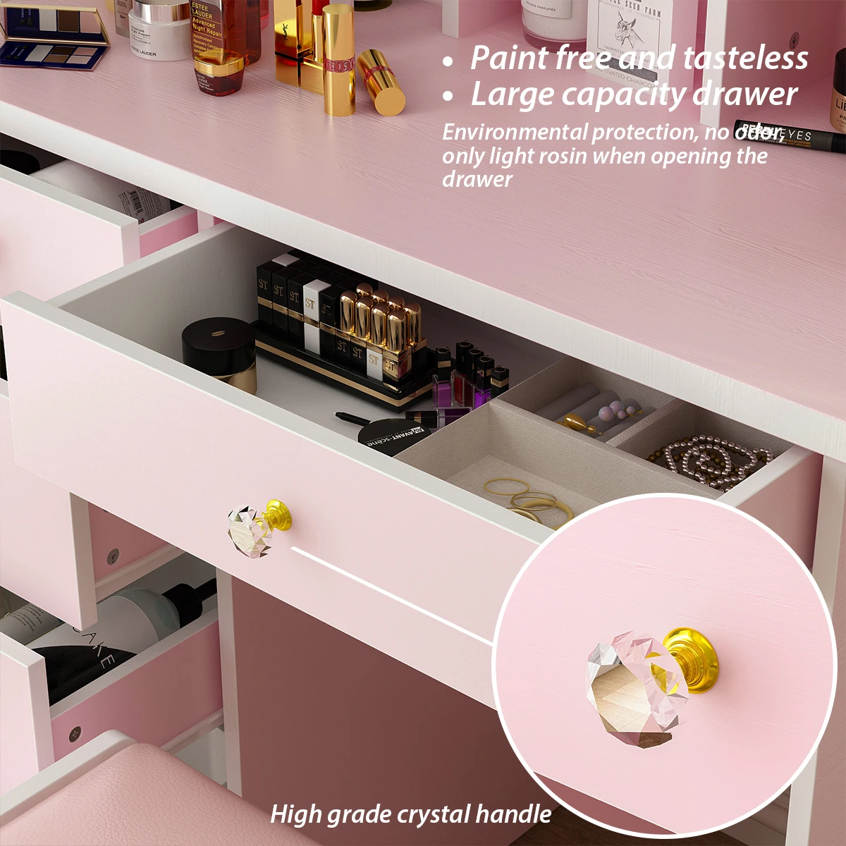 【Complete Vanity Set】The pink color paired with natural wood crystal handles gives this vanity table a sweet and charming look. It's perfect for girls' bedrooms or spaces with a feminine decor theme, adding a touch of cuteness.Comes with a stool and a mirror. The stool is comfortable for sitting, and the mirror allows you to see yourself clearly while applying makeup or doing your hair.