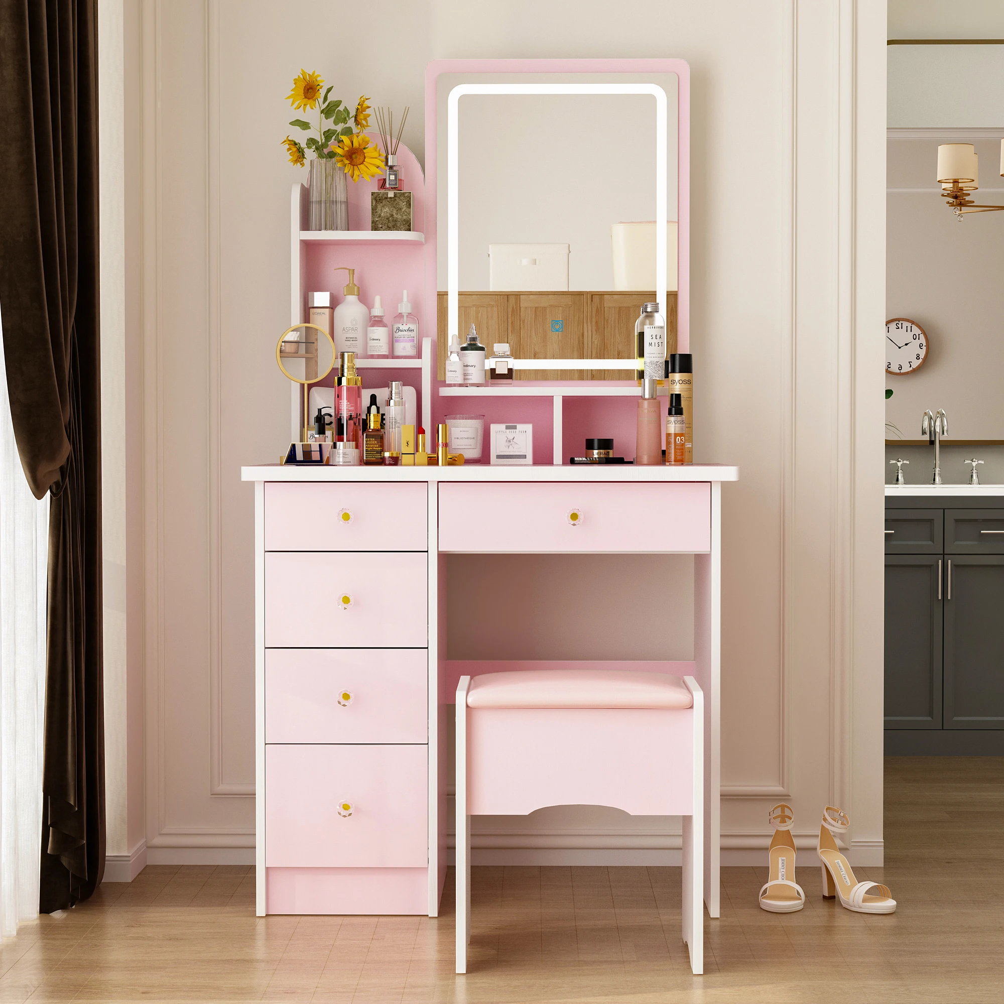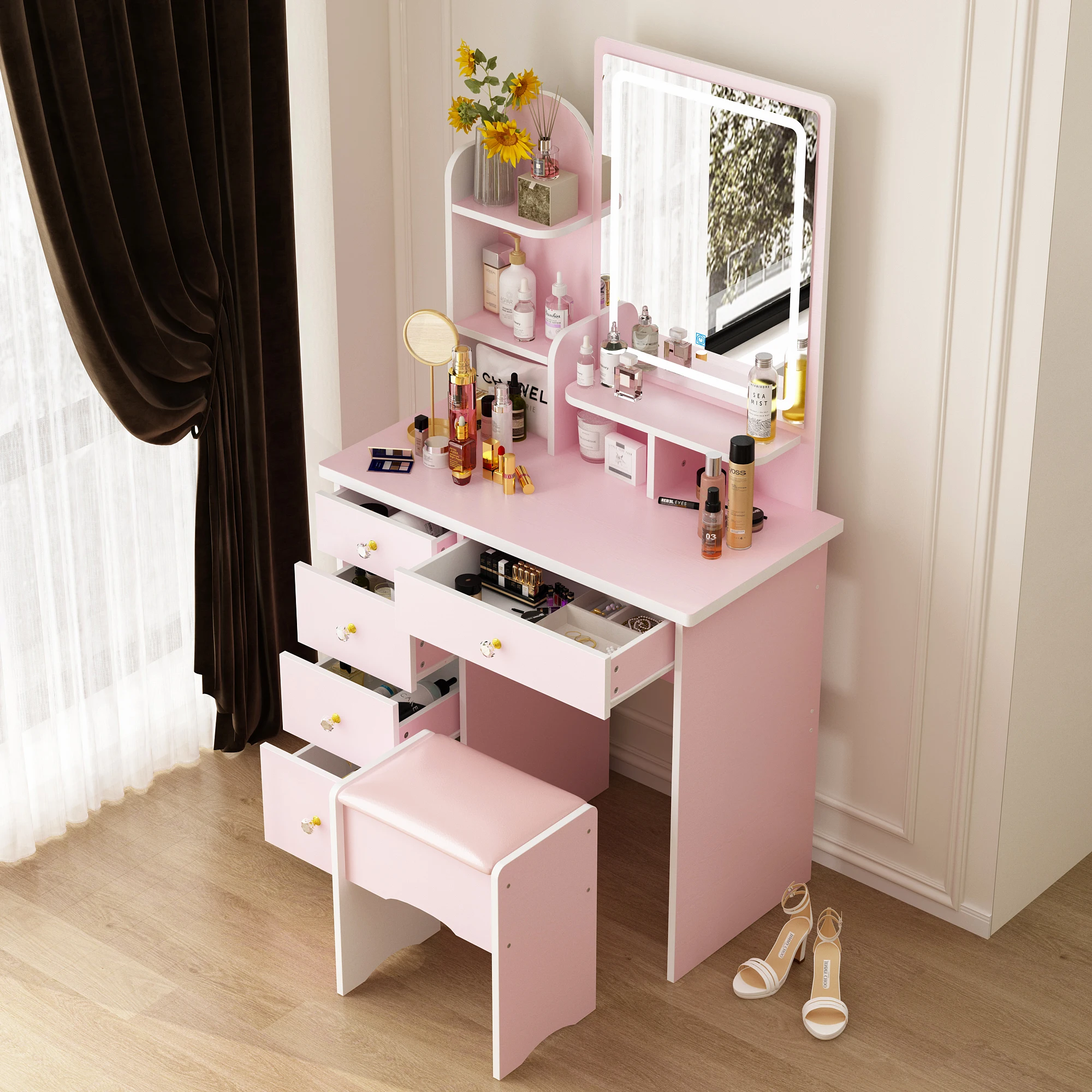 This pink vanity table with natural wood crystal handles and LED lights is a charming and functional option. Made of durable MDF, it has 5 drawers, multiple open shelves, and a roomy tabletop. The adjustable lights, along with the stool and mirror, make makeup time a delight.