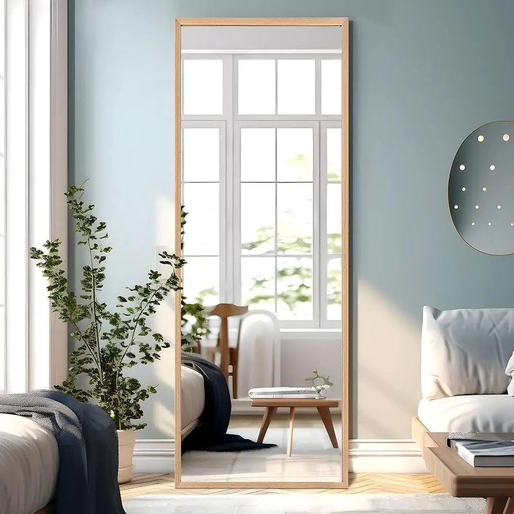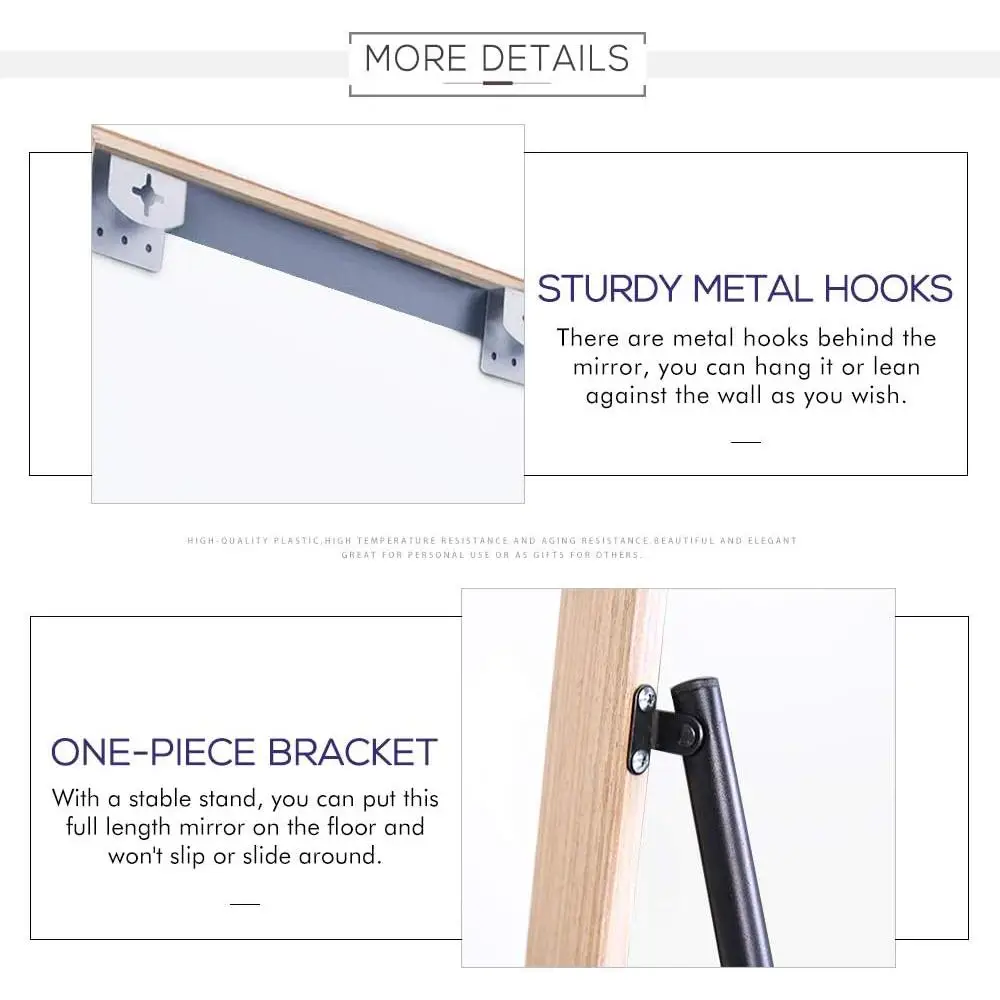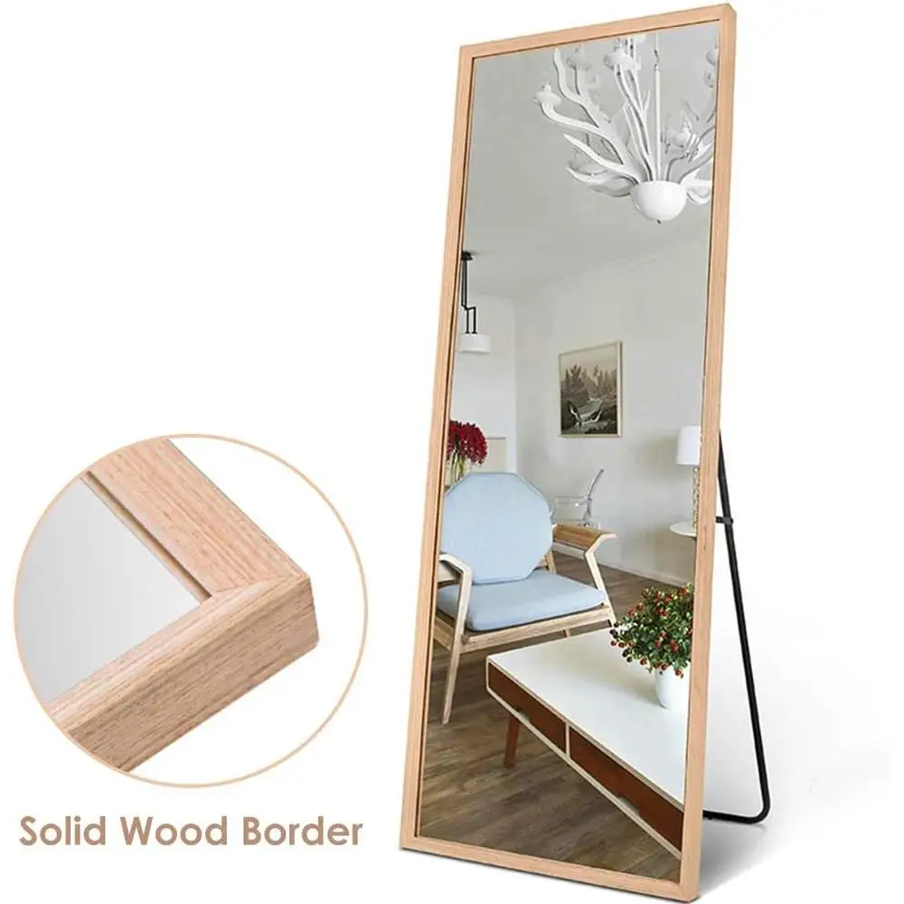 About this item    Wood    FULL SIZE FLOOR MIRROR - Overall Size: 65x22.  Large enough for you to see your full outfit in a single glance.     QUALITY MATERIAL - The frame is made of solid wood natural color simple and graceful.  The mirror use shatter-proof glass more safe more reassuring.     FLOOR STAND DESIGN & WALL-MOUNTED DESIGN – The mirror can lean to the wall or standing anywhere with the stand or you can hang it on the wall for space-saving.     WIDE APPLICATION – suitable for bedroom living room locker room behind of the door corridor clothing shop