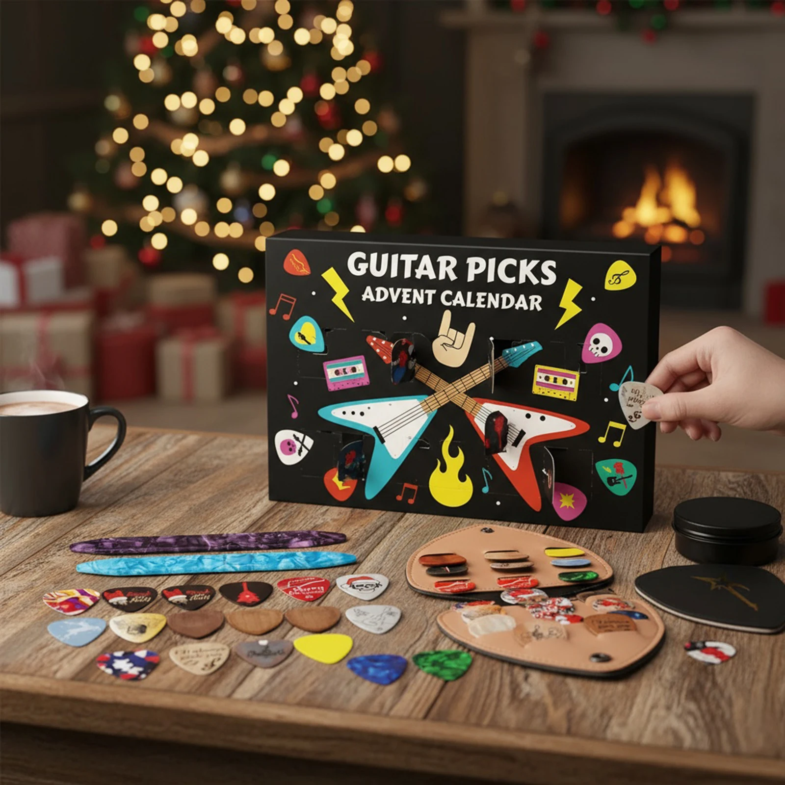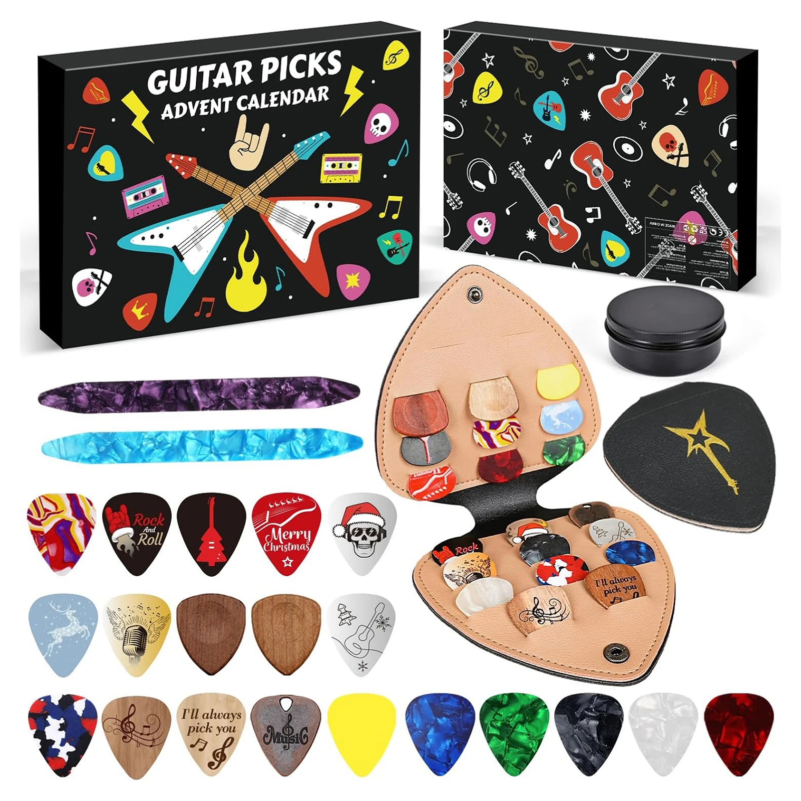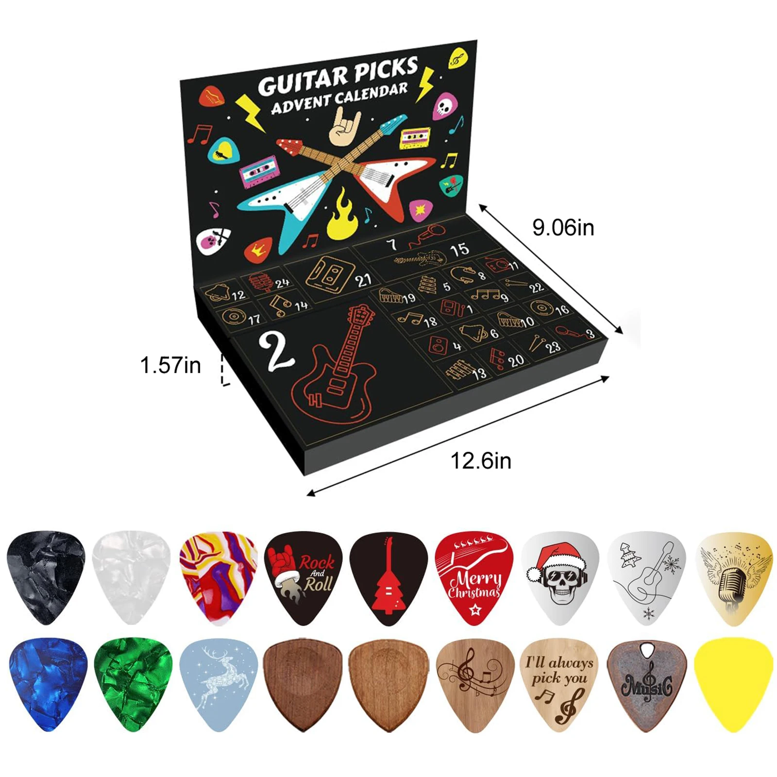 Guitar Picks Advent Calendar 2025 Christmas Ornament 24 Days of Musical Surprises Musical Fun Countdown Gift Box with Celluloid & Wood Picks Christmas Countdown Calendar Christmas Gift for Guitar Bass